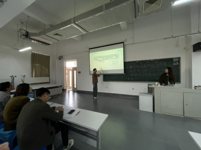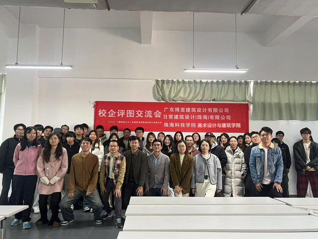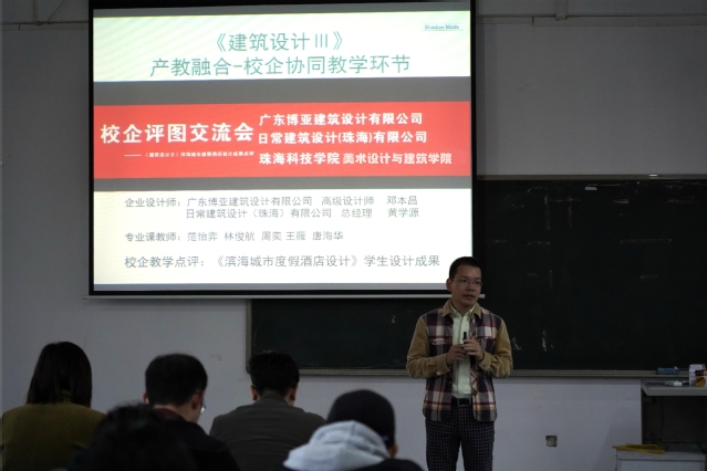 2024年12月26日,学院《建筑设计Ⅲ》课程教改项目负责人林俊航老师及项目组一线教学成员范怡弈、周奕、王薇、唐海华等教师邀请了两个产学研基地建设合作单位的一线工作专员——广东博亚建筑设计有限公司高级设计师、工程师邓本昌和日常建筑设计(珠海)有限公司总经理、工程师黄学源入校进课堂开展产教融合校企协同教学活动,对本学期《建筑设计Ⅲ》后八周的《滨海城市度假酒店设计》教学成果图纸进行公开点评及交流。