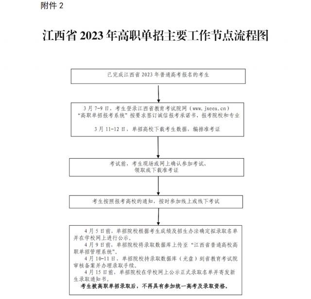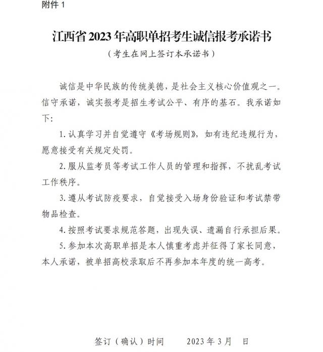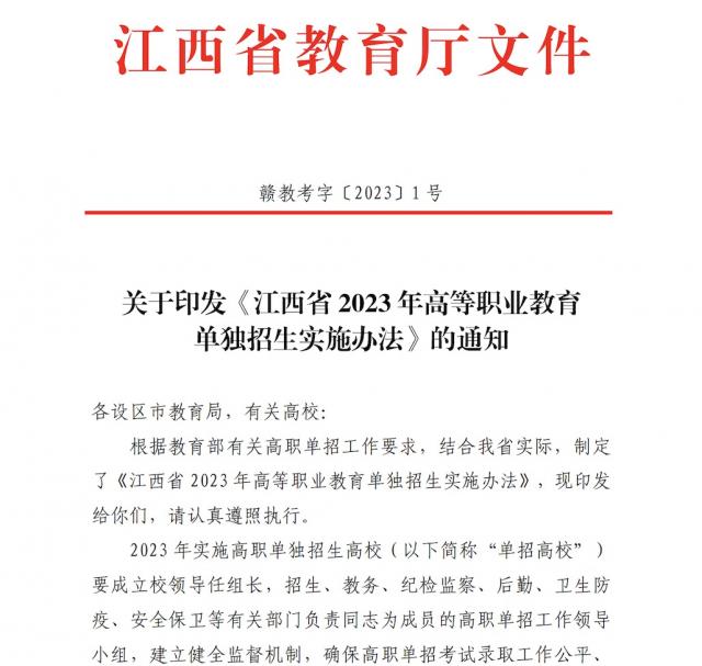 根据教育部有关高职单招工作要求,结合我省实际,现制定《江西省 2023 年高等职业教育单独招生实施办法》(以下简称《单招办法》)。一、招生原则2023年高等职业教育单独招生工作(以下简称“高职单招”)坚持公平、公正、公开原则,由省教育厅有关部门统筹规划,单招高校组织实施,省教育考试院进行考试录取监督,确保我省高职单招的各项工作管理严格,规范有序。二、招生高校经省教育厅批准 2023 年开展高职单独招生的高校(名单将另行发布)。三、招生对象已完成江西省 2023 年普通高考报名的考生均可报考。尚未完成高考报名的,可于 3 月 1-3 日到户籍或毕业学校所在县(市、区)教育考试中心办理补报名手续。四、招生简章各单招高校应根据教育部及省教育厅有关高等职业教育单独招生工作规定,按照本《单招办法》要求,结合自身办学实际,研究制定2023年高职单招简章(包括考试办法、单招专业、单招计划数、录取规则等)并向社会公布。五、考生报考1.网上报考:3月7日9:00-9日17:00 期间,考生自行登录江西省教育考试院网(网址:www.jxeea.cn)“高职单招报考系统”,签订《江西省 2023 年高职单招考生诚信报考承诺书》(见附件1,承诺高职单招录取后不再参加2023年 6 月举行的统一高考),每个考生限报1所高校,可选不超过5个专业及是否服从专业调剂。在规定的网报时间内,考生可以对所报考院校及专业修改1次。2.数据下载:单招高校于 3 月 11-12 日前在“江西省普通高校高职单招管理系统”下载报考本校考生数据。3.考试确认:考生须按照报考高校的要求按时到现场或网上确认参加考试,领取或下载准考证。六、考试工作高职单招考试由单招高校组织实施,以“文化素质+职业技能(或职业适应性)”测试为主,可以开展多校联合命题、联合考试,在确保安全、公平的前提下可以采用线上测试。1.考试要求:单招高校应组建命题专家组,科学、合理设计考试内容和评分标准,采取“文化素质+职业技能”的考试评价方式,总分满分为 450 分(文化素质部分占比不超过 50%)。其中,文化素质考试科目为语文、数学。职业技能或职业适应性测试可以根据招生专业的培养要求进行设计。2.考试时间:在 3 月底前,由各单招高校根据实际情况自行安排考试时间并通知考生。3.考试纪律:严格执行国家教育考试考务管理的规定及要求,监考人员要认真查验考生身份,严格考务管理、严肃考场纪律、加强诚信教育。加大巡查力度,切实维护高职单招的考试环境和良好的考试秩序。采用线上考试的高校,一要做好线上考试系统安全性、稳定性的全面测试;二要加强线上监考人员培训,包括处置各类偶发、突发情况应急培训;三要给每一位考生提供不少于2次的线上测试演练;四要优化系统功能,通过人脸识别逐一验证考生身份,强化监考,严防各种线上考试舞弊行为;五要对考试过程进行全程录像备查。4.考试成绩:单招高校要严格按照教育部和省教育厅有关评卷工作管理要求,切实做好评卷组织、管理、质量监控和安全保密工作。评卷、统分结束后,应及时在本校网站上提供考生成绩查询,并制订考生成绩复核办法及程序,为考生提供成绩复核服务。七、录取工作(一)录取原则单招高校应合理确定文化素质和技能测试分数的录取控制线,按照简章向社会公布的招生专业、招生计划数及录取规则择优录取考生。高职单招录取严格执行省教育厅下达各校的单招计划和单招专业,不得违规突破。考生在录取后不得退录。(二)优惠政策高职单招录取执行普通高校招生录取相关优惠政策。具体见《江西省关于进一步深化高考加分改革的实施方案》(赣招委字〔2019〕25号)。(三)录取安排1.4月5日前,单招院校确定拟录取考生名单并在本校网站进行公示。2.4月9日前,单招院校将录取数据库上传至“江西省普通高校高职单招管理系统”。4月10-11日持录取数据库(光盘)到省教育考试院审核备案并办理录取手续。3.4月15日前,单招院校在本校网站公布正式录取的考生名单,寄发本校印制的录取通知书。(四)录取说明1.通过高职单招录取的考生,与参加统一高考录取的考生享受相同待遇。2.高职单招录取的考生须参加所在县(区)考试中心统一组织的高考体检。新生入校后,高校可依据教育部、卫生部、中国残疾人联合会印发的《普通高等学校招生体检工作指导意见》和人力资源社会保障部、教育部、卫生部《关于进一步规范入学和就业体检项目维护乙肝表面抗原携带者入学和就业权利的通知》等有关要求以及学校招生章程中对身体条件的具体规定,对高考体检或新生入学复检结论涉及限报的单招考生可进行调整专业以及退学、休学等处理。3.考生经高职单招录取后,不再具有参加统一高考及录取资格。八、工作要求(一)加强组织领导各单招高校要认真履行主体责任,主要负责同志是第一责任人。学校成立工作领导小组,切实落实好各项职责分工。1.完善考试安全方案。单招高校要召开单招工作领导小组会议,认真研究制定考试安全工作方案。要按照国家教育考试安全保密工作要求,细化完善考试安全保密、命题制卷、考试组织、评卷统分、监督管理等办法,工作方案既要符合属地防疫要求,又要确保考试安全和公平。2.认真落实防疫要求。单招高校按照属地卫健部门要求做好防疫组考工作,指导考生做好个人防护