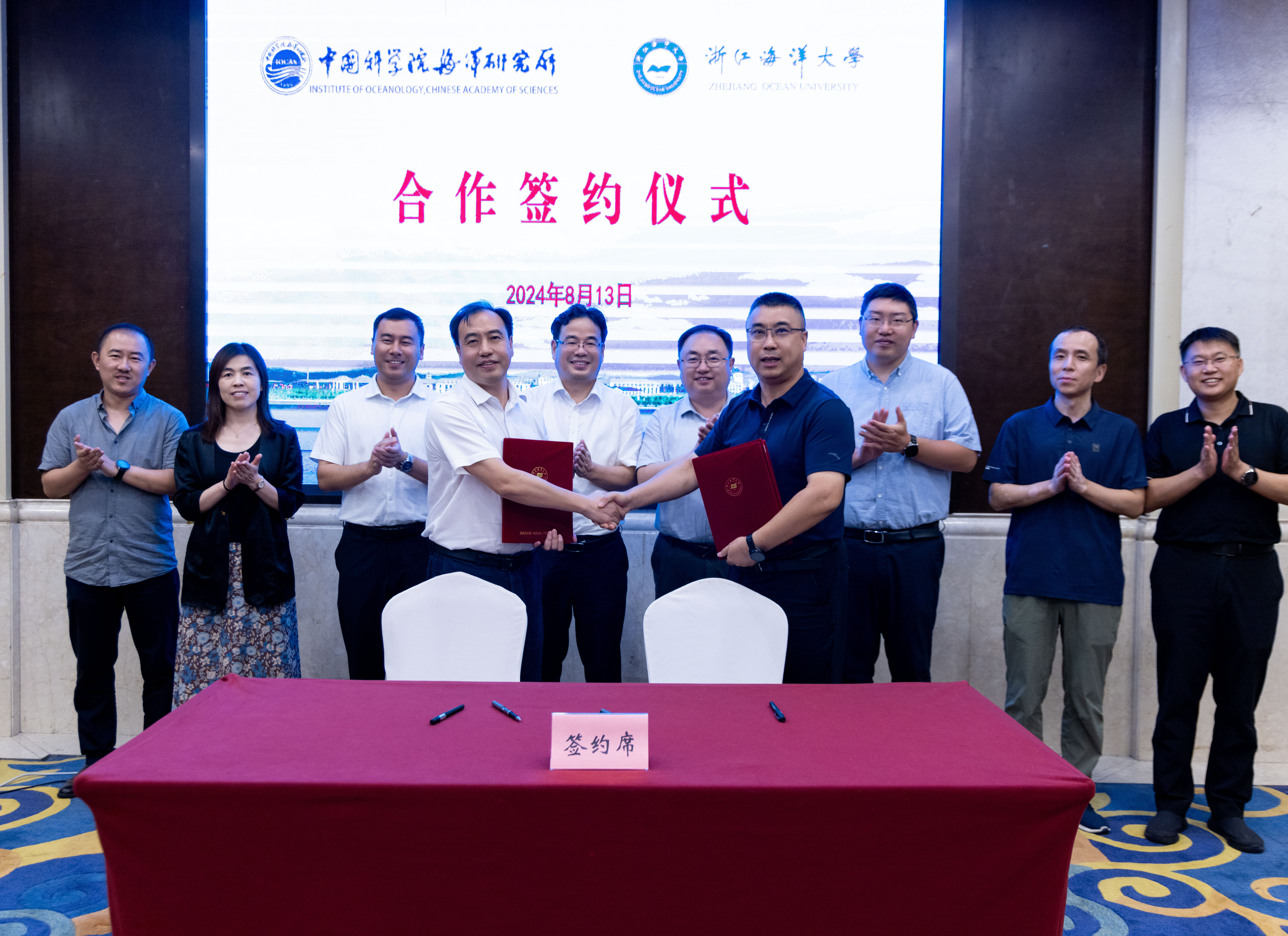 8月13日下午,浙江海洋大学与中国科学院海洋研究所全面战略合作协议签约仪式在舟山财富酒店举行。中国科学院海洋研究所所长王凡、副所长沙忠利、所务委员汪嘉宁与浙江海洋大学党委书记严小军、副校长王健鑫出席签约仪式。