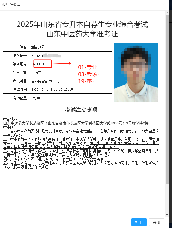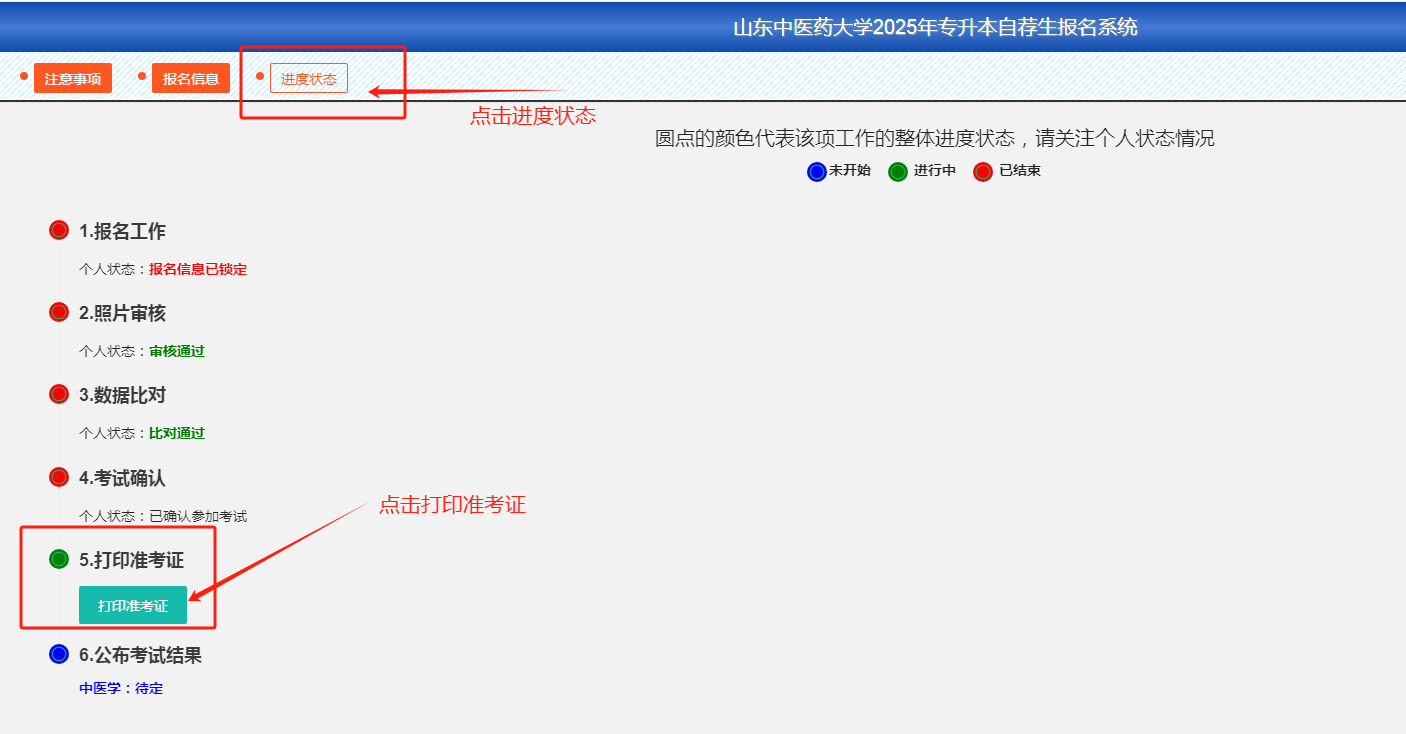 准考证打印时间:2025年3月1日10:00前,考生可登陆山东中医药大学本科招生信息网,点击“网上报名”,进入“学校2025年专升本自荐考生专业综合能力测试报名系统”(专升本自荐生报名 (sdutcm.edu.cn)),点击“进度状态”,选择“打印准考证”。