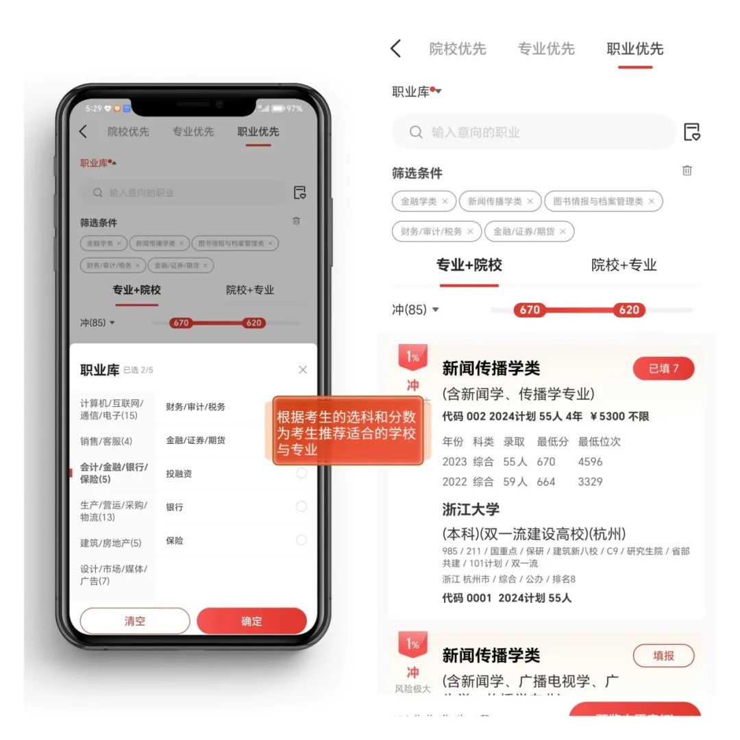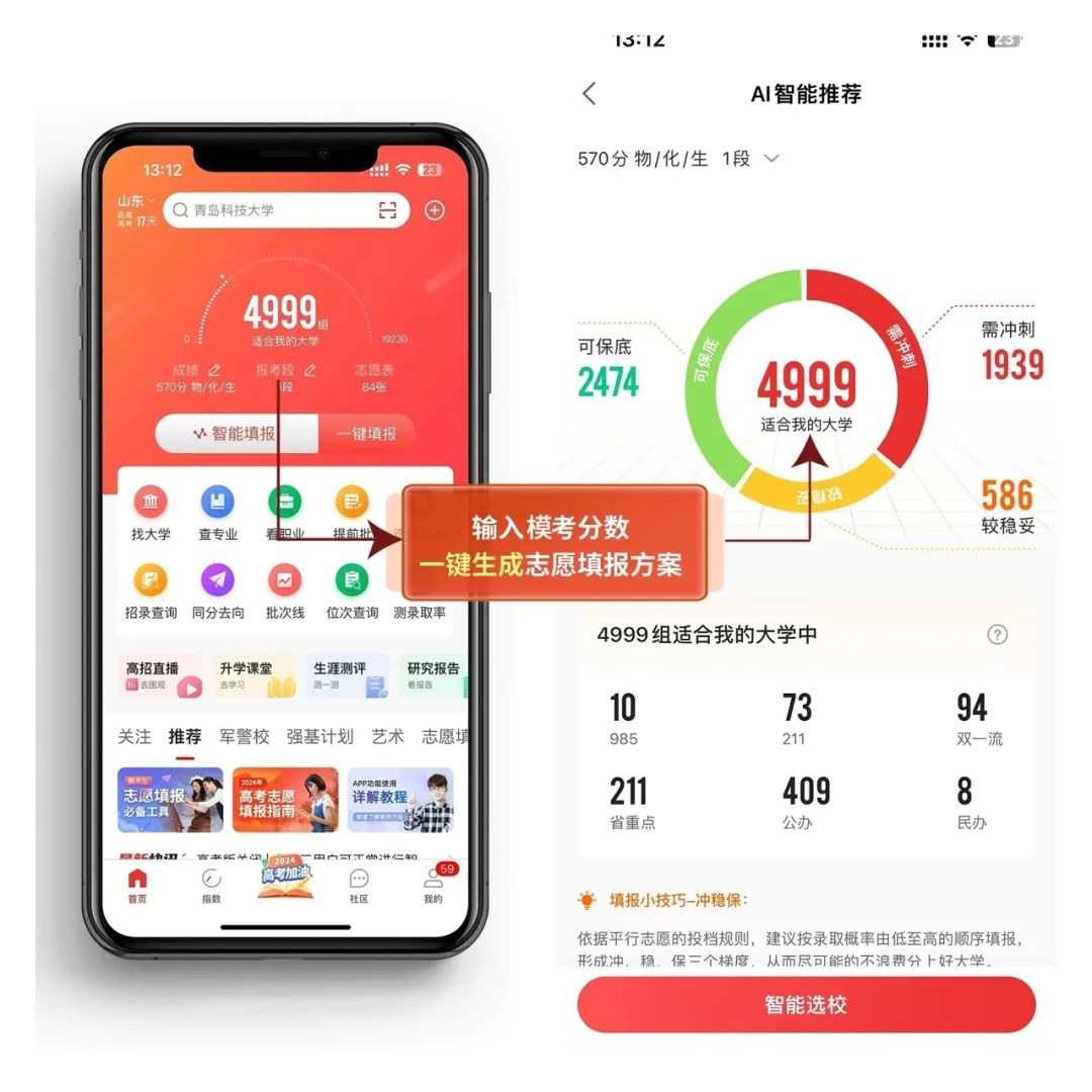 点击【首页】-【智能填报】版块,输入选科与模拟考分数,系统会智能推荐录取率高的院校和专业,推荐结果很有参考价值,精确度达99%,往届考生和家长纷纷给以好评!