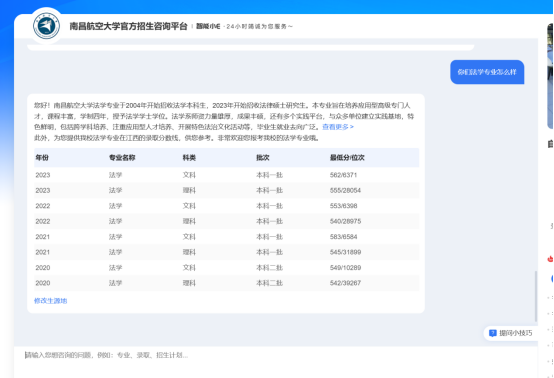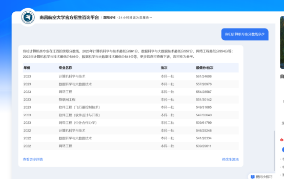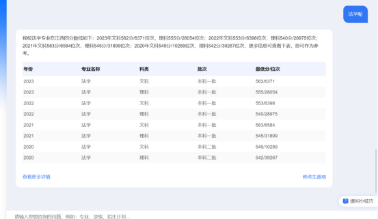 当你问“我是江西考生,今年考了570分,选科是物化生,想学你们学校计算机专业,能被录取吗”时,系统不仅能通过DeepSeek大模型技术精准识别你的咨询意图是:省份、分数、选科要求、录取分数,还会结合历年录取数据,为你提供精准的回复!