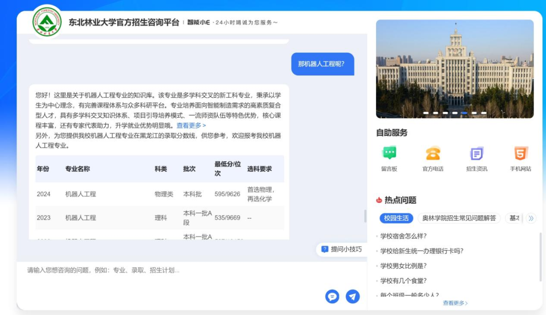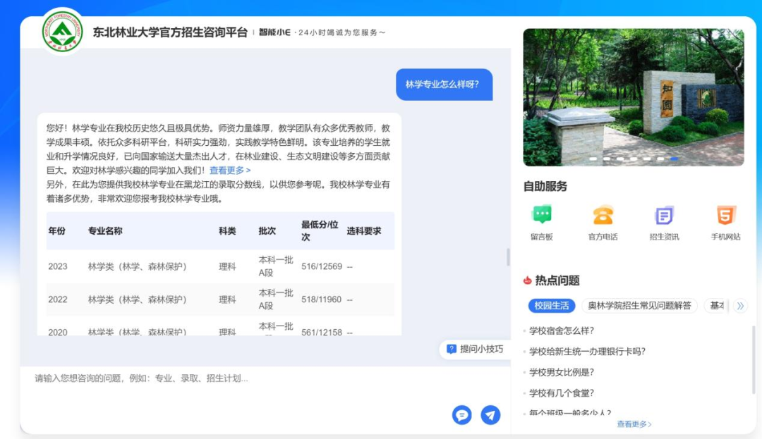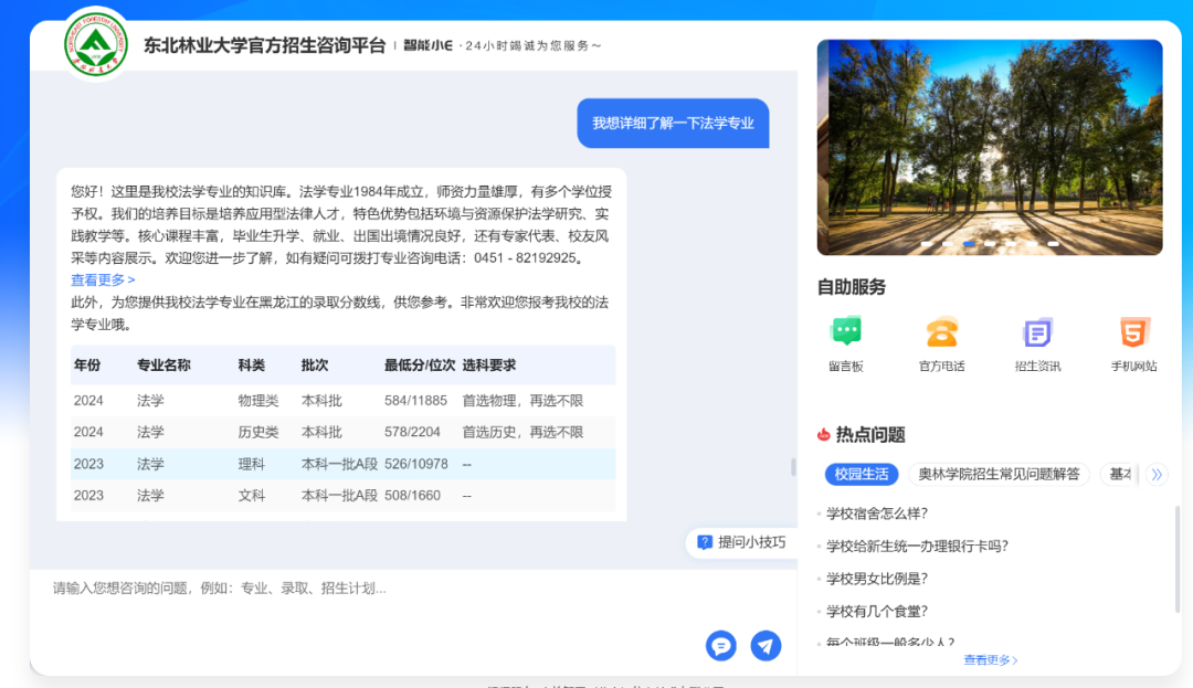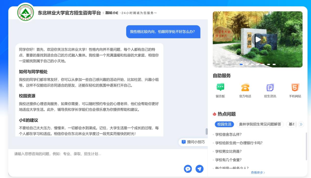 除了直接的答案,我们更希望能为学子和家长们呈现一个立体的东北林业大学。DeepSeek版本的智能招生问答系统,不仅能直接解答疑惑,更能在回复你的咨询问题的同时,为你智能关联至相关专业介绍、校园文化等丰富内容,让你“全方位、多角度”地了解我们。