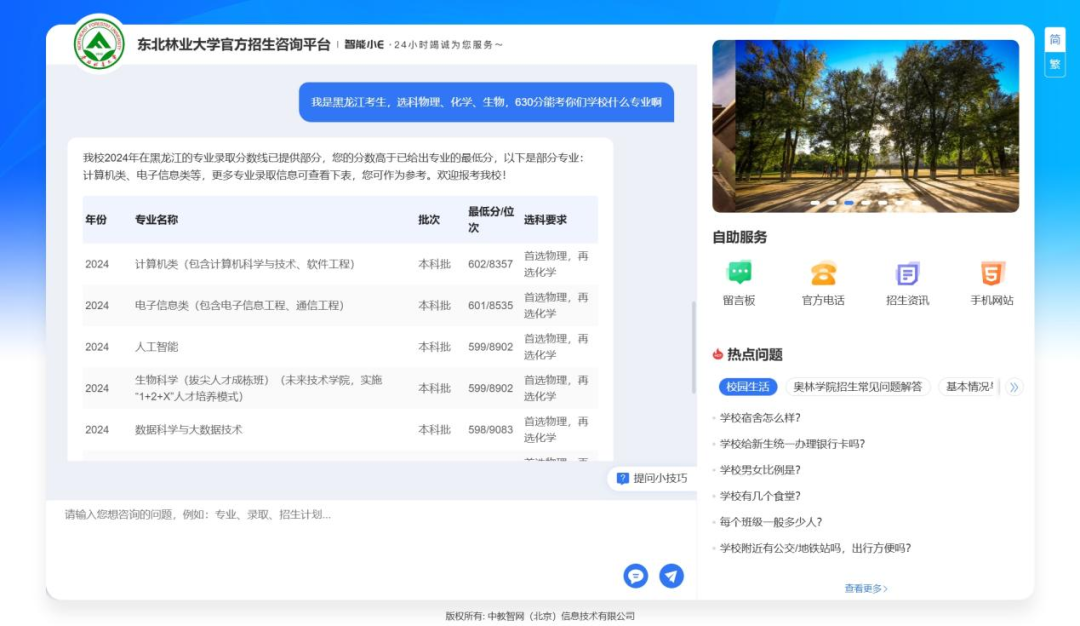 问答示例:当你问“我是黑龙江考生,选科物理、化学、生物,630分能考你们学校什么专业啊?”时,系统不仅能通过DeepSeek大模型技术精准识别你的咨询意图是:省份、分数、录取分数,还会结合历年录取数据,为你提供更有参考性的回复!