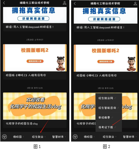 重点提醒:请及时关注湖南化工职业技术学院公众号,于3月6日在公众号的“招生就业”导航栏点击进入“准考证下载”,考试具体时间和考场等信息可在准考证上查看。