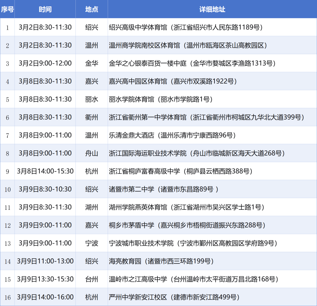 为助力考生及家长精准掌握招生政策,我校定于3月2日-9日,开展"高职提前招生面对面"全省巡回咨询服务,活动将深入绍兴、温州、金华、嘉兴、丽水、衢州、舟山、杭州、湖州、宁波、台州等11个地市。现场提供:✓ 最新政策权威解读✓ 报考流程专项指导✓ 专业特色深度解析✓ 志愿填报精准答疑 浙同科招生团队将以地市巡回形式(具体日程详见附表),零距离为考生提供个性化咨询服务。金榜题名之路,我们与您携手同行!