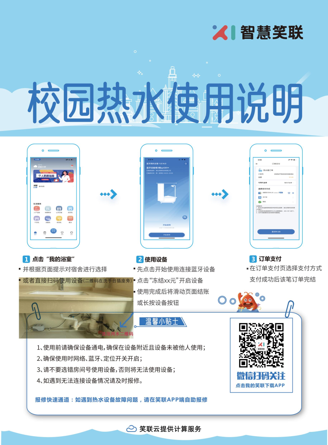 热水供应和计费:宿舍热水供应需要通过“智慧笑联”平台使用,四季都有冷热水,热水每天供应时间段为: