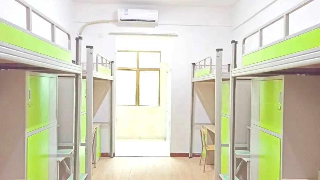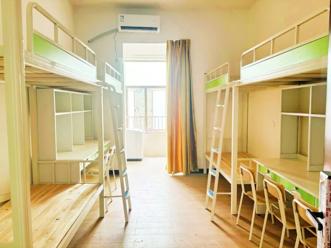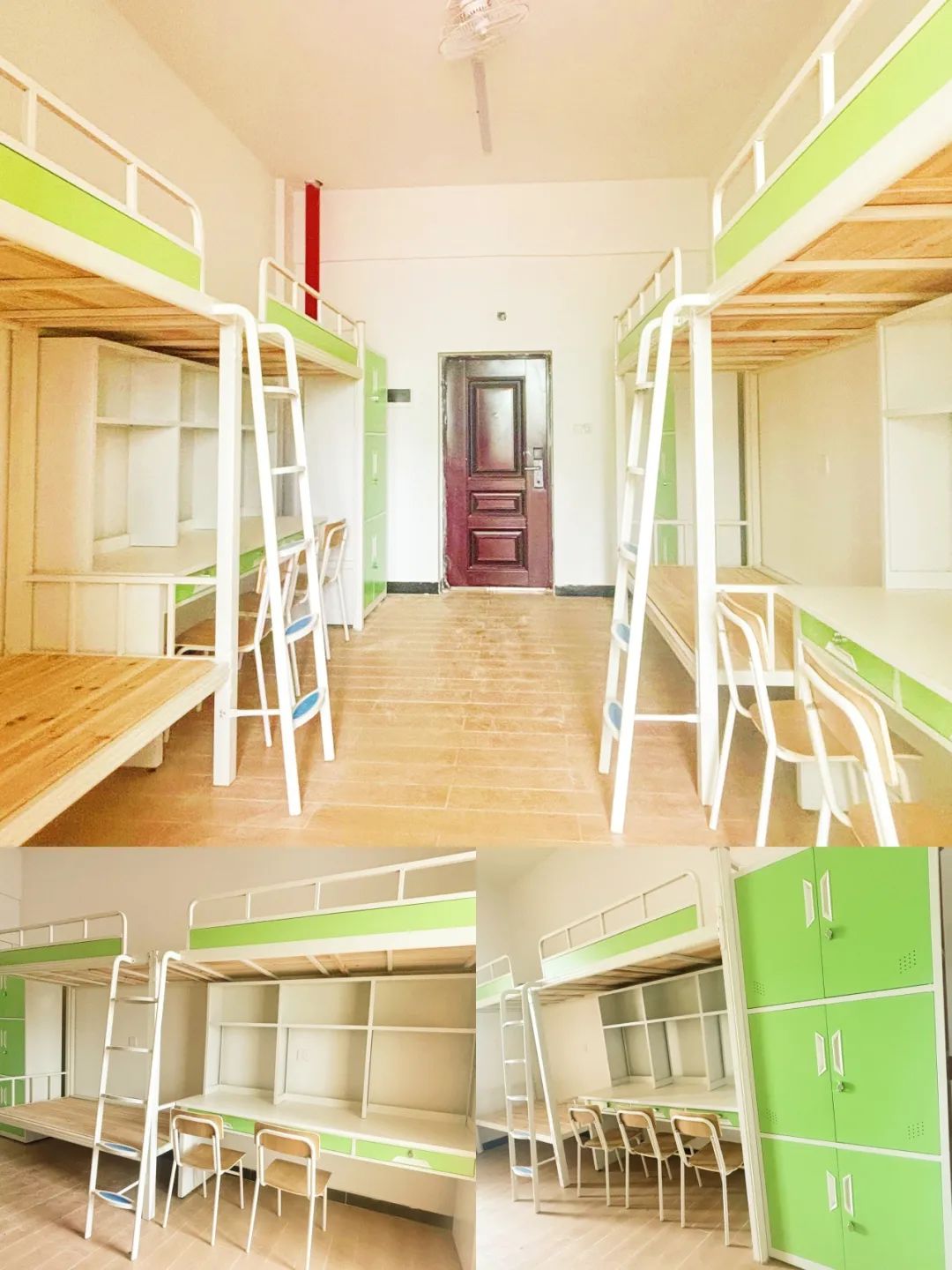 床的规格:床尺寸大小为90cm×210cm。两张床共用一个阶梯,所以侧面开的蚊帐会方便进出,阶梯下有足够的空间供同学们放置个人物品,床上和生活用品大家可按实际需求自行采购。