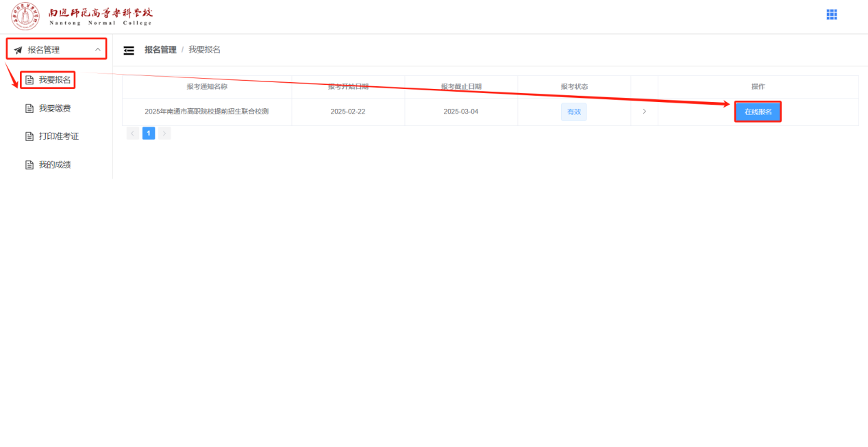点击【报名管理】-【我要报名】-【在线报名】,输入考生报考相关信息,提交报名。