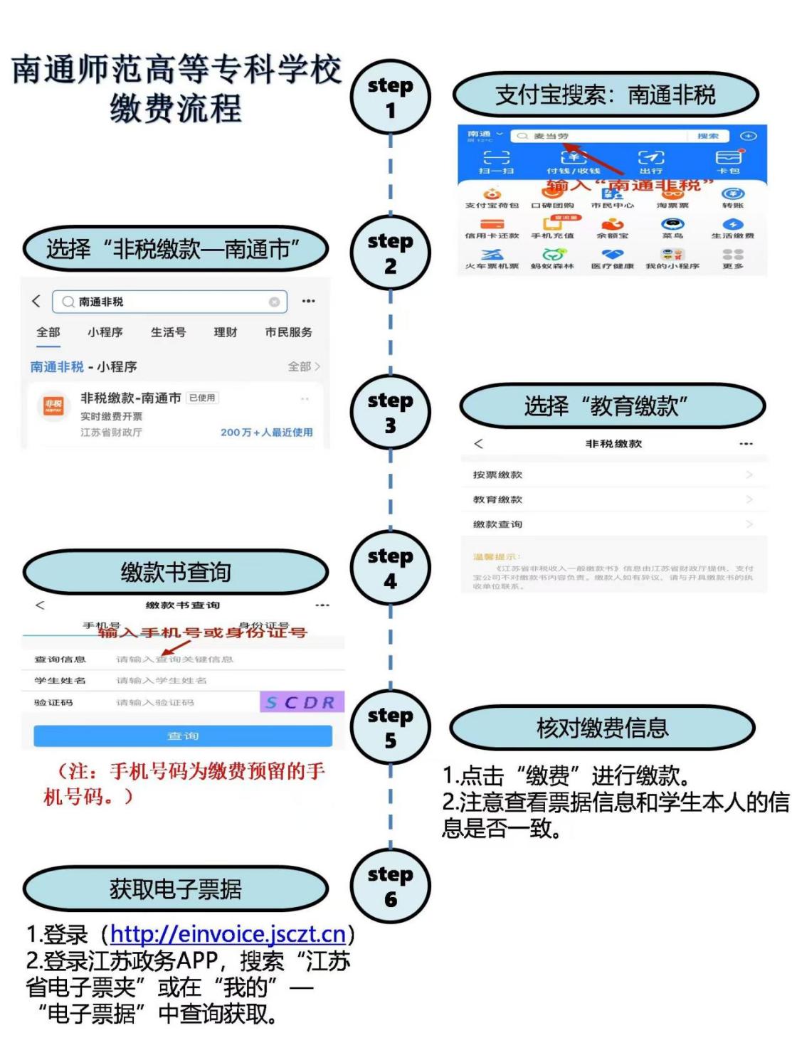 财务处根据学生报名成功信息,上传财政收费系统,学生将会收到江苏省统一公共支付平台发放的短信,示例:【江苏省统一公共支付平台】非税缴费提醒:执收单位南通师范高等专科学校,缴款码320600250100******,金额60.00元。您可通过江苏政务服务网或苏服办APP的“统一支付”;工行、农行、中行、交行、华夏、江苏、招商、邮储等手机银行APP或者支付宝的“非税缴费”相关栏目进行缴款(如已完成缴款,请忽略此短信)。学生可以通过支付宝或者短信提供的方式进行缴费,缴费途径见流程图: