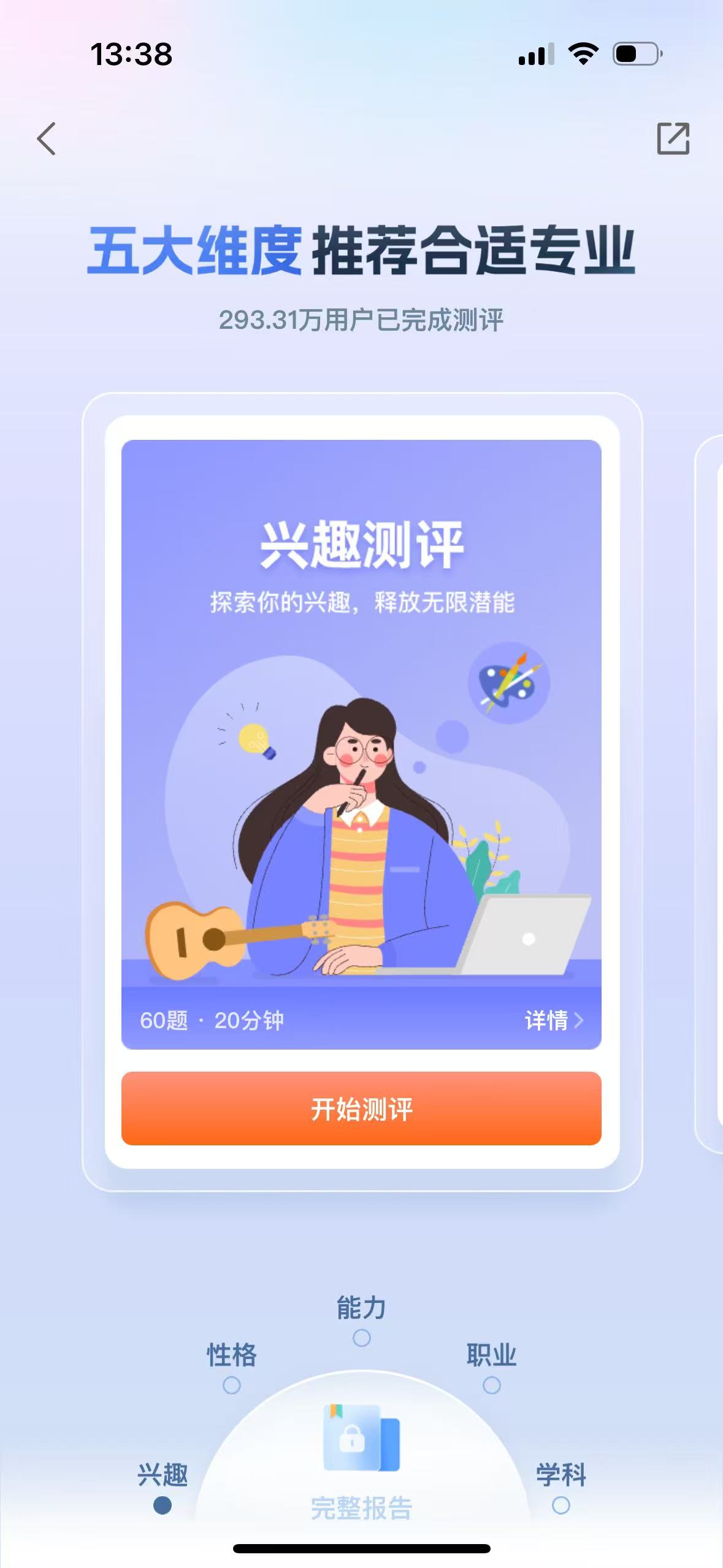 使用优志愿APP【查专业】-【专业测评】功能,从五大维度为考生推荐合适的专业,助力考生的志愿填报。