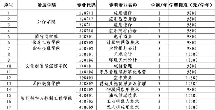 山东外国语职业技术大学2025年高职专科专业学费标准