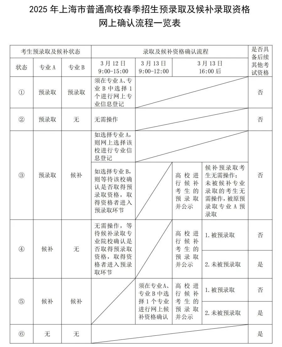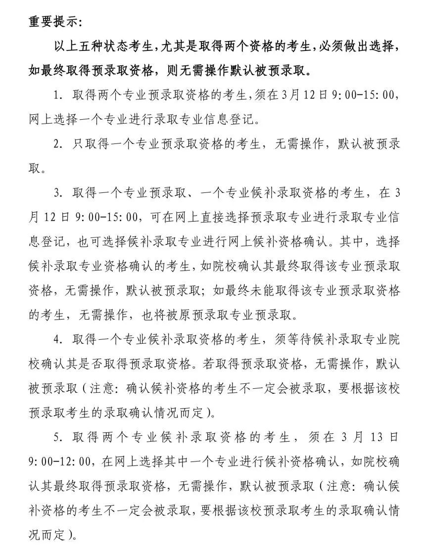 3.取得两个专业候补录取资格的考生,须在3月13日9:00-12:00,在网上选择一个专业进行候补资格确认,如院校确认最终取得预录取资格,默认被预录取,无需操作。
