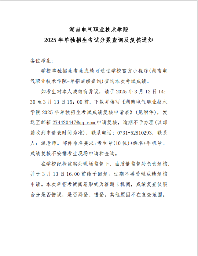 附件:《湖南电气职业技术学院2025年单独招生考试成绩复核申请表》
