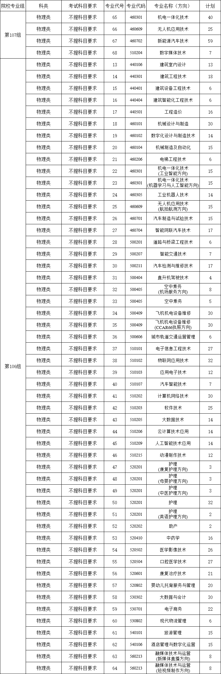 高职高专批专业代号及计划数,科类:物理类