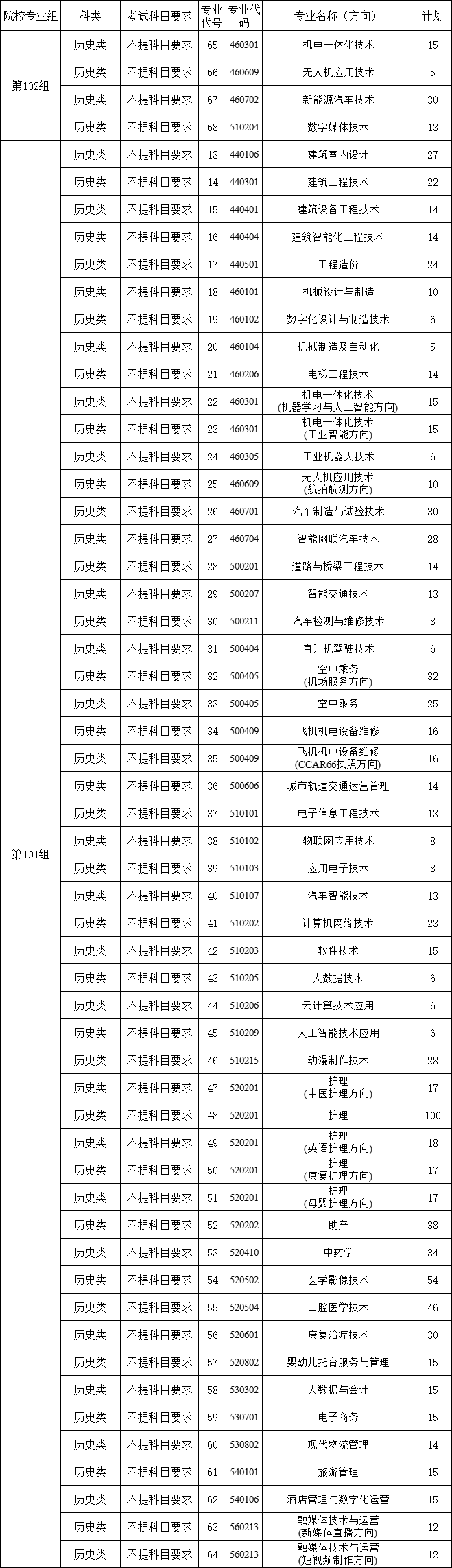 高职高专批专业代号及计划数,科类:历史类