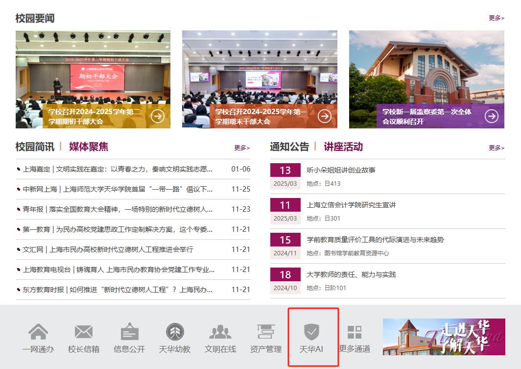 一是通过校园网主页,点击校园网下方“天华AI”图标直接进入;
