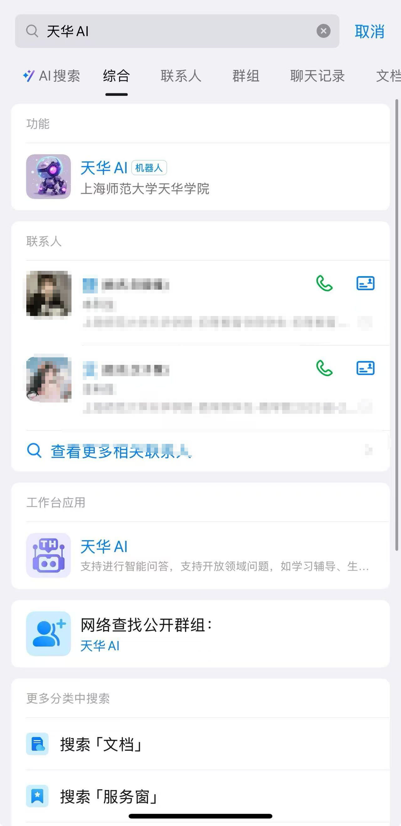 三是通过上海师范大学天华学院钉钉搜索“天华AI”,或在“天华钉”工作平台“新增应用”中点击“天华AI”图标进入。