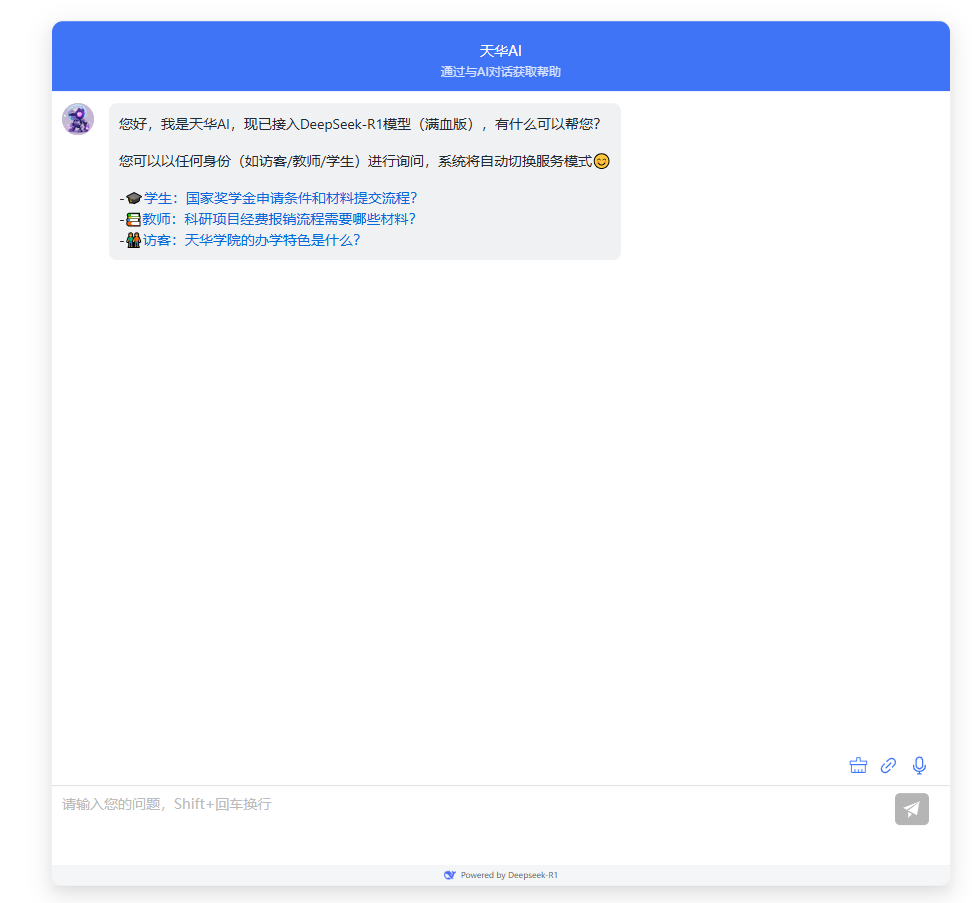 依托DeepSeek强大的语义理解与逻辑推理能力,“天华AI”建构了多个行政服务类知识库和教育教学类知识库,目前已覆盖学校规章制度查询、管理服务流程解答等场景,并且持续不断更新知识库动态。 “天华AI”面向全社会开放,实现了7×24小时智能应答。无论是学校规章制度解析、生活服务指南,均可一键获取答案。