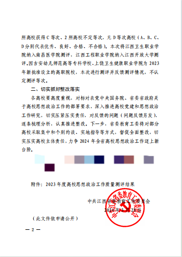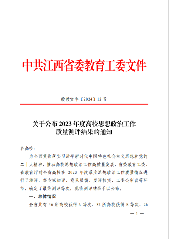 近日,省委教育工委发布《关于公布2023年度高校思想政治工作质量测评结果的通知》,经专家初评、反馈意见、复评核实、工委会审议等环节,我校荣获2023年度江西省思想政治工作质量测评A等次,这也是我校连续两年被评为A等次。据悉,全省共有46所高校获得A等次,我校考评成绩在全省同类高校中位居前列。