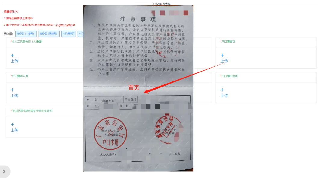 注:可参考上图,上传学生证原件(含本人照片)、应届初中毕业证明、学籍基本信息表三种其一即可,都需加盖学校公章!