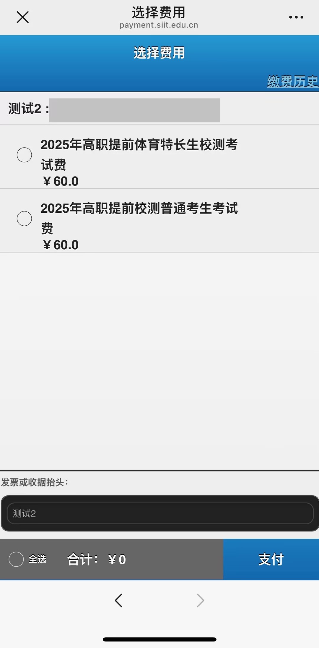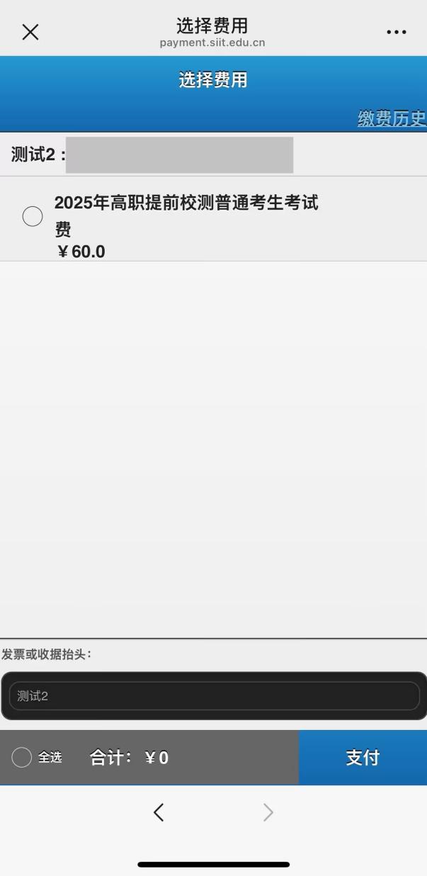 2.输入登录信息。用户名为身份证号,密码为身份证后6位,点击“登录”(如图2)。选择缴费项①“2025年高职提前校测普通考生考试费”或②“2025年高职提前体育特长生校测考试费”,如考生涉及①②两个缴费项请务必分开缴费,不可合并缴费。