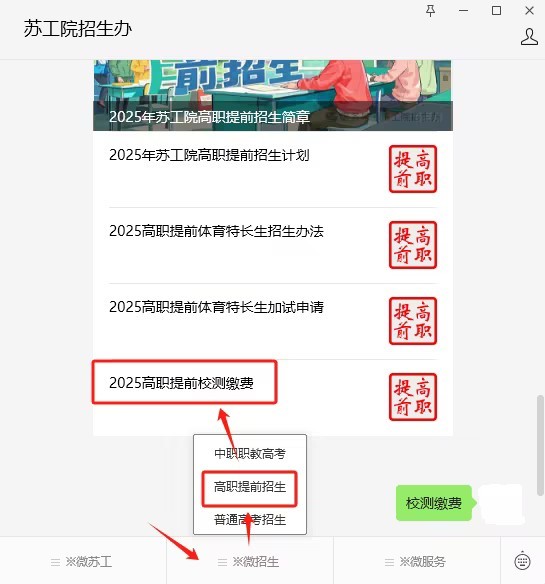 11.打开微信,关注“苏工院招生办”,点击“微招生-高职提前招生”(如图1)。