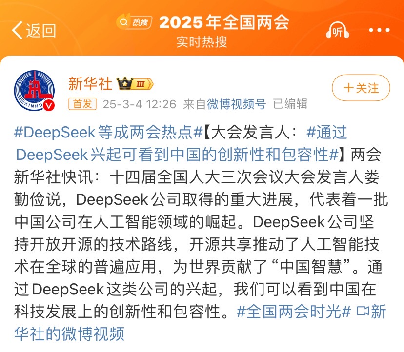 最近一段时间,关于DeepSeek的讨论非常火爆,热度持续上升。在近期召开的全国两会中,DeepSeek一词也成为了大会热点,大会发言人提及了“DeepSeek公司取得的突破性进展,代表着一批公司在人工智能领域的崛起“,这无疑凸显了国家及各行各业对人工智能领域的重视。AI技术的发展正在重塑行业格局。