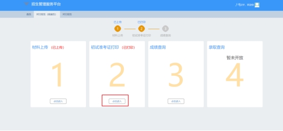 2.按照提示输入姓名、身份证号(有X大写)和验证码登陆系统。进入系统后点击下方菜单“对口招生(点击操作)”,进入准考证打印页面。
