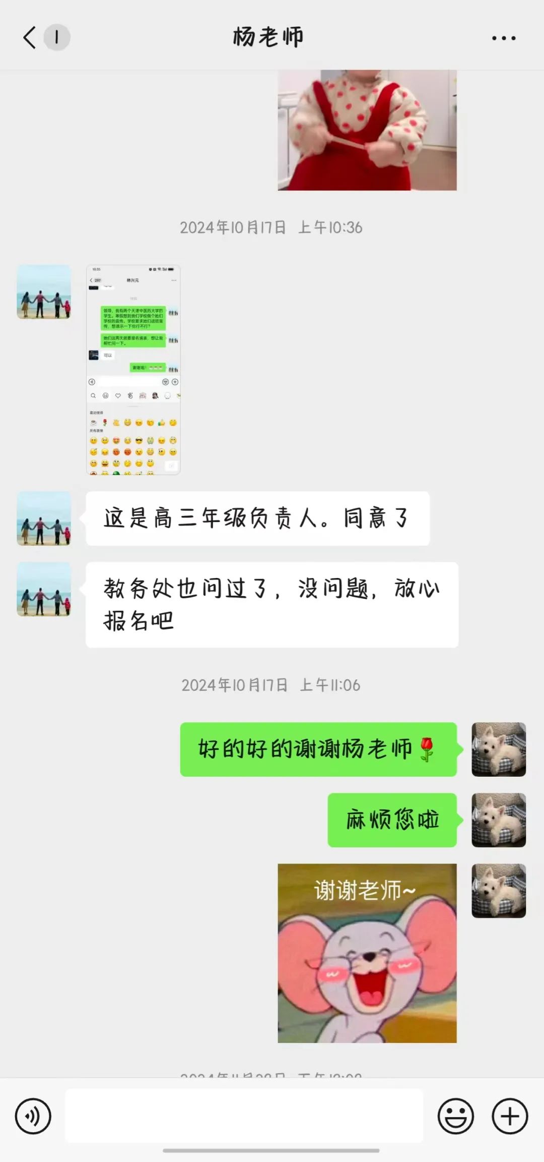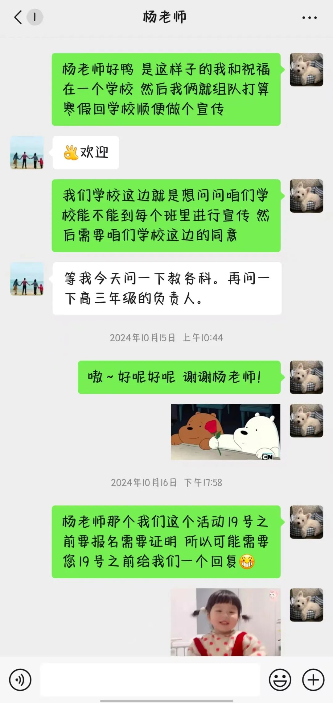 为有效开展高校招生宣传工作,我团队在活动筹备初期即与母校教务处杨老师建立专项对接机制。通过微信沟通,就宣讲时间、场地安排、受众群体等核心议题进行充分沟通,在获得校方正式授权后,迅速启动系统性筹备工作。