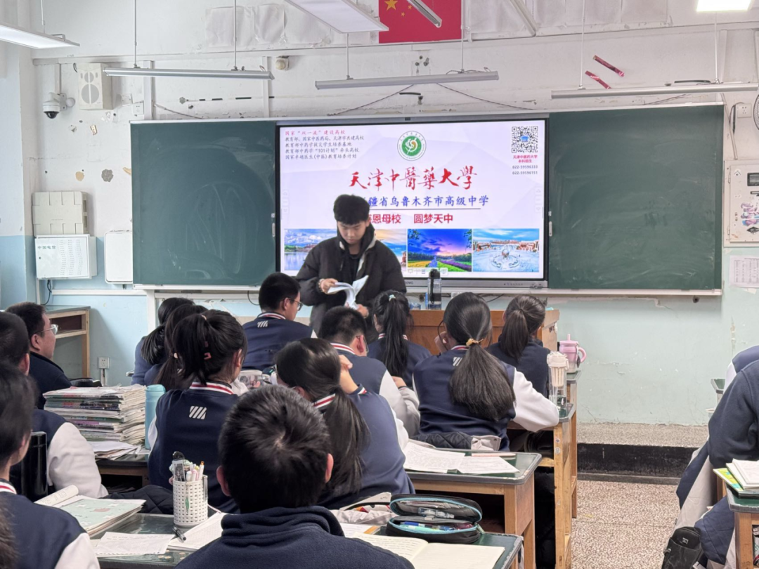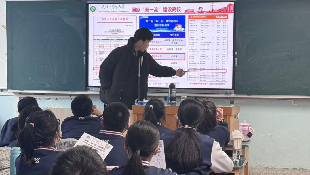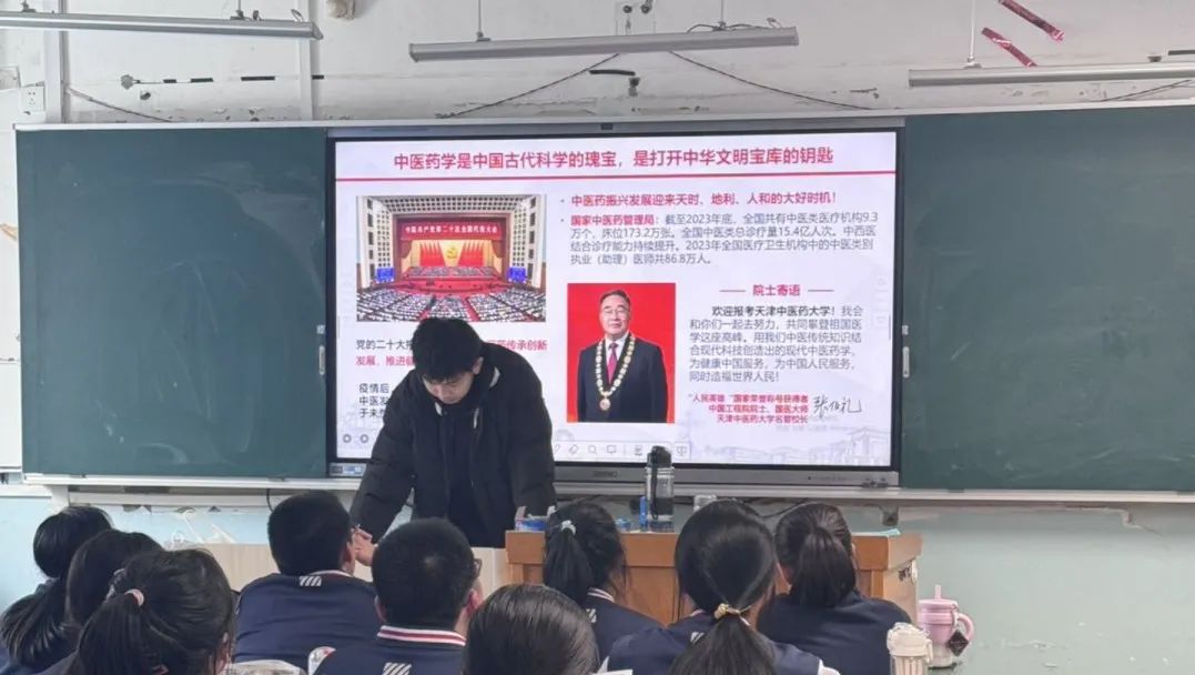 宣讲过程中,团队成员在学校提供的PPT的基础上,根据母校实际情况进行改动,通过PPT展示我们的宣讲内容,从天津中医药大学的发展历史,地理位置,到学校教学水平,学风建设与环境设施等方面突出展现了我校的优势与实力,同时结合自身经历,讲述丰富多彩的大学生活,比如有趣的社团活动、充实的实习经历、紧张的学术研究,让学弟学妹对大学生活充满向往。