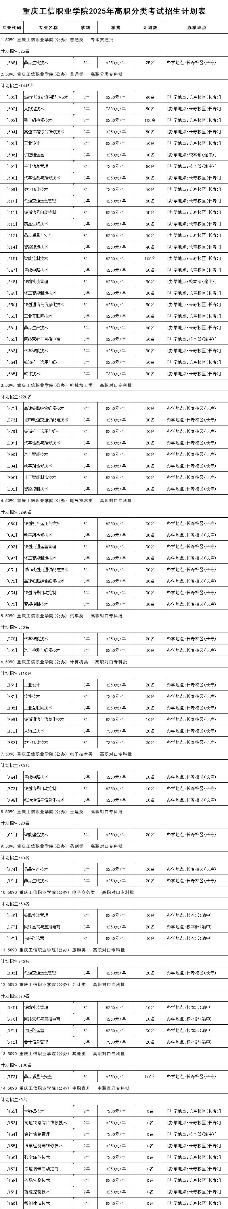 重庆工信职业学院2025年高职分类考试招生计划表