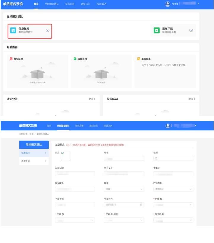 登录成功后,点击“单招报名确认”--“信息核对”按钮,按要求完成报名确认及信息完善。(请确认报名信息无误后提交!并进行报名登记表下载)