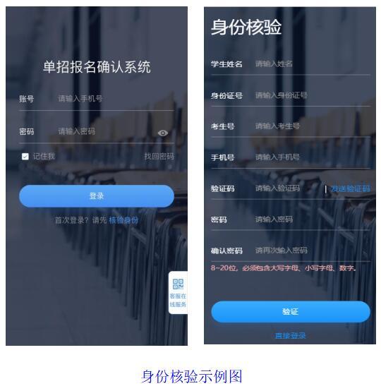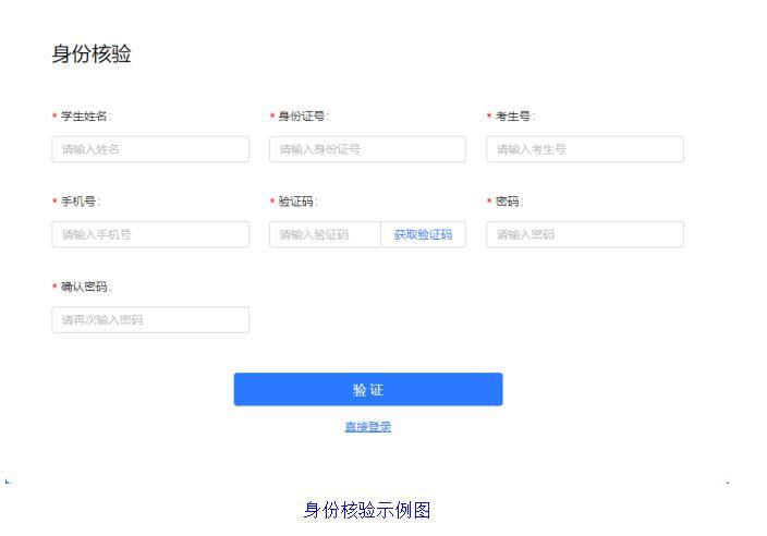点击下方“核验身份”按要求使用“身份证号”、“考生号”等填写信息完成身份验证,注册成功后登录系统。(后续若密码忘记,请点击“找回密码”通过短信验证方式重置密码。)