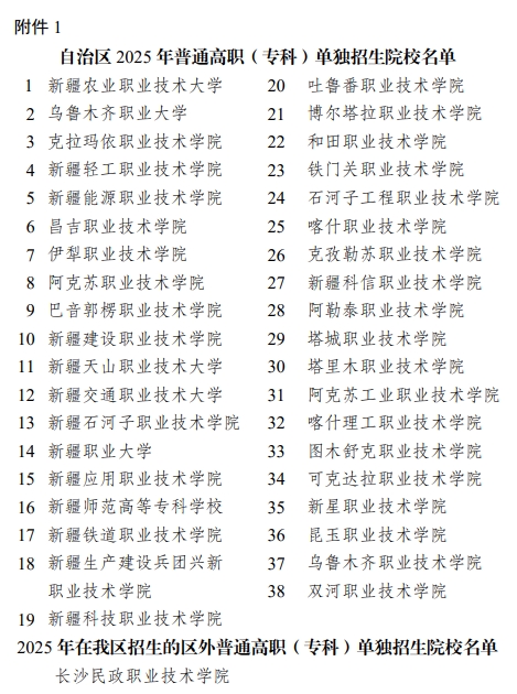 附件:1.自治区2025年普通高职(专科)单独招生院校名单