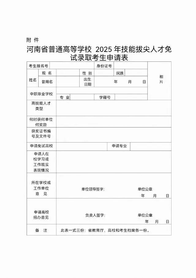 (一)考生本人在4月2日前填写《河南省普通高等学校招收技能拔尖人才免试入学登记表》,提出免试入学申请。由生源学校负责确认考生获奖情况。