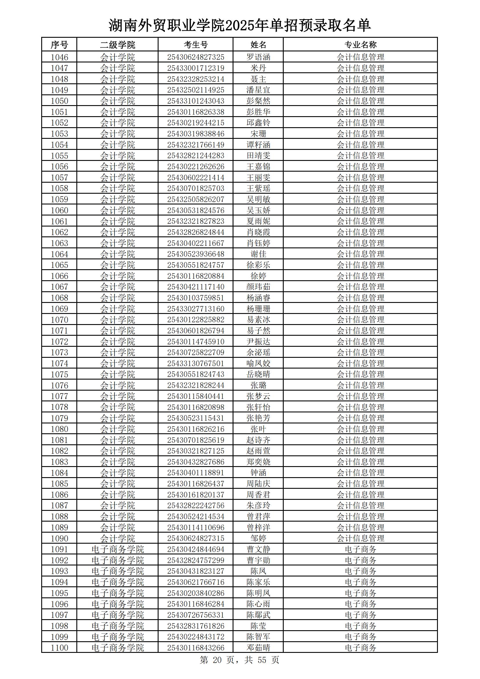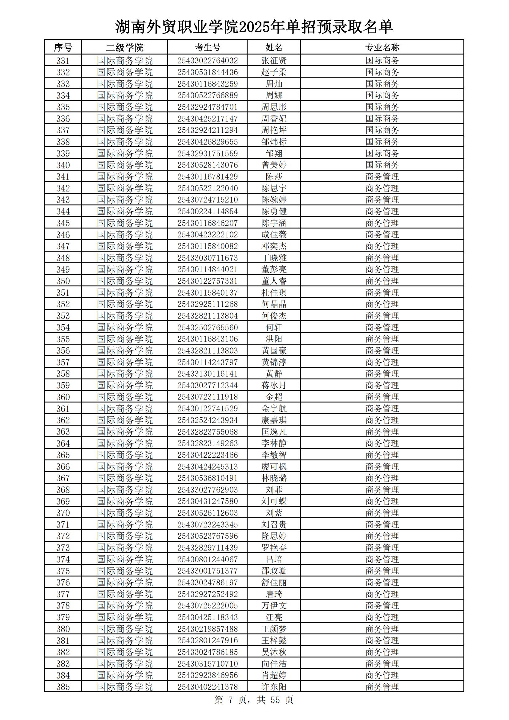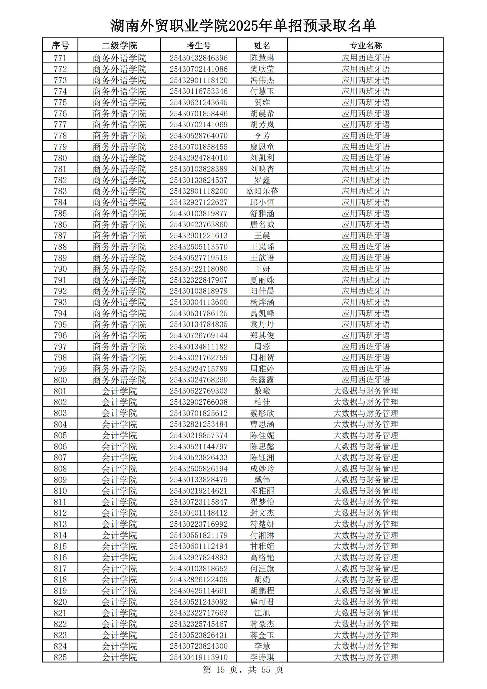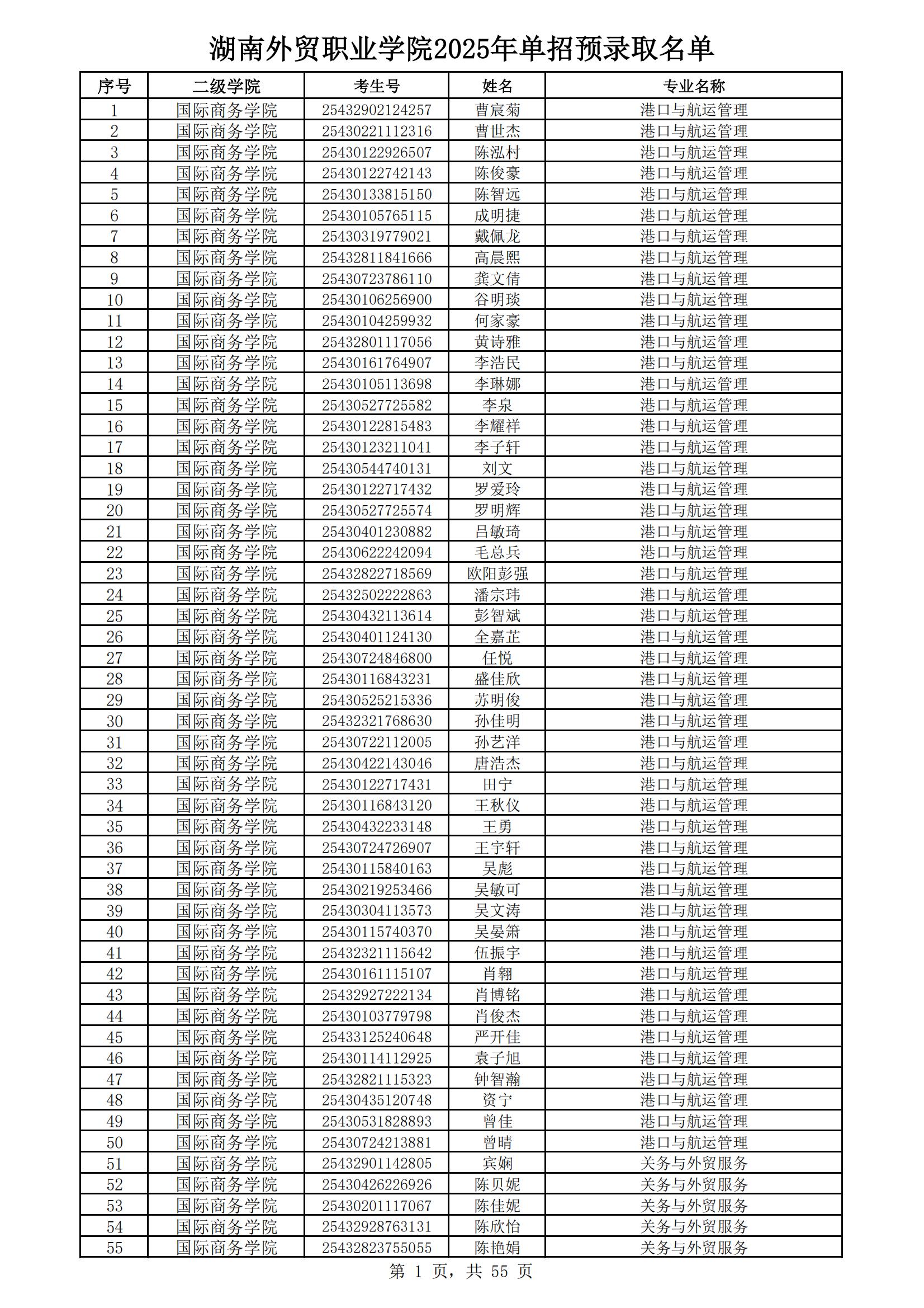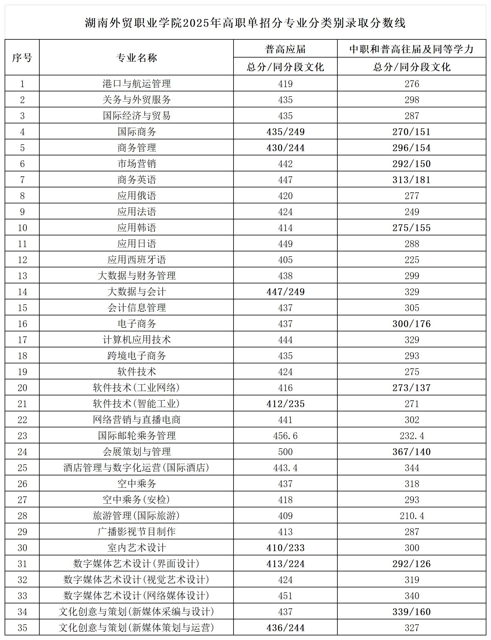 根据《湖南外贸职业学院2025年高职单招章程》录取规则,经学院党委审议并报省教育考试院审核通过,现将我院2025年高职单招分专业分类别拟录取分数线及预录取名单公示如下: 一、拟录取信息公示 公示时间:2025年3月25日-3月31日 (1)分专业分类别录取分数线 1.录取原则:“志愿优先”。 2.对于末位同分考生,依据以下规则进行录取:若末位同分,按考生文化素质测试成绩从高到低排名依次录取。若文化素质测试成绩仍相同:则按“语、数、外”顺序,进行单科成绩排序从高到低依次录取。