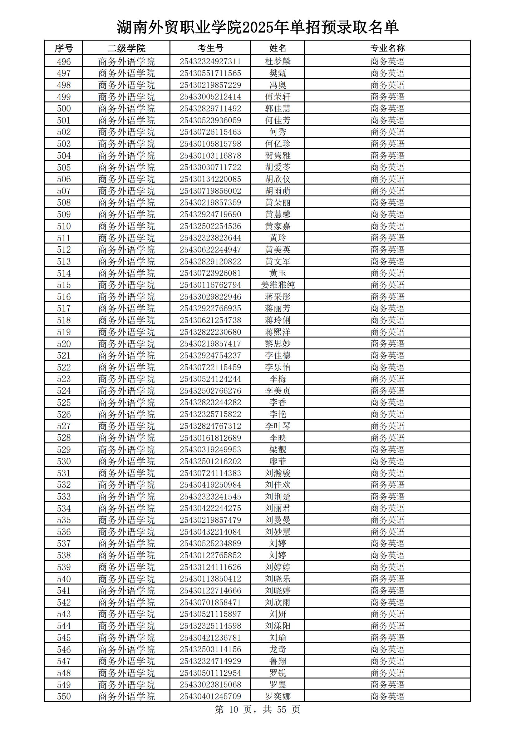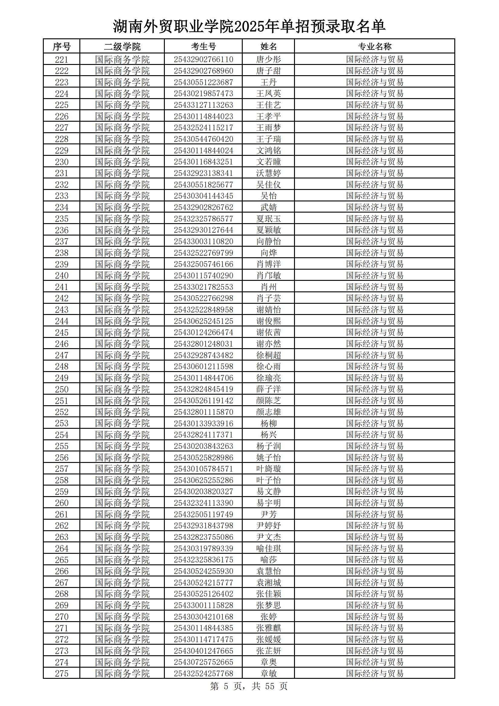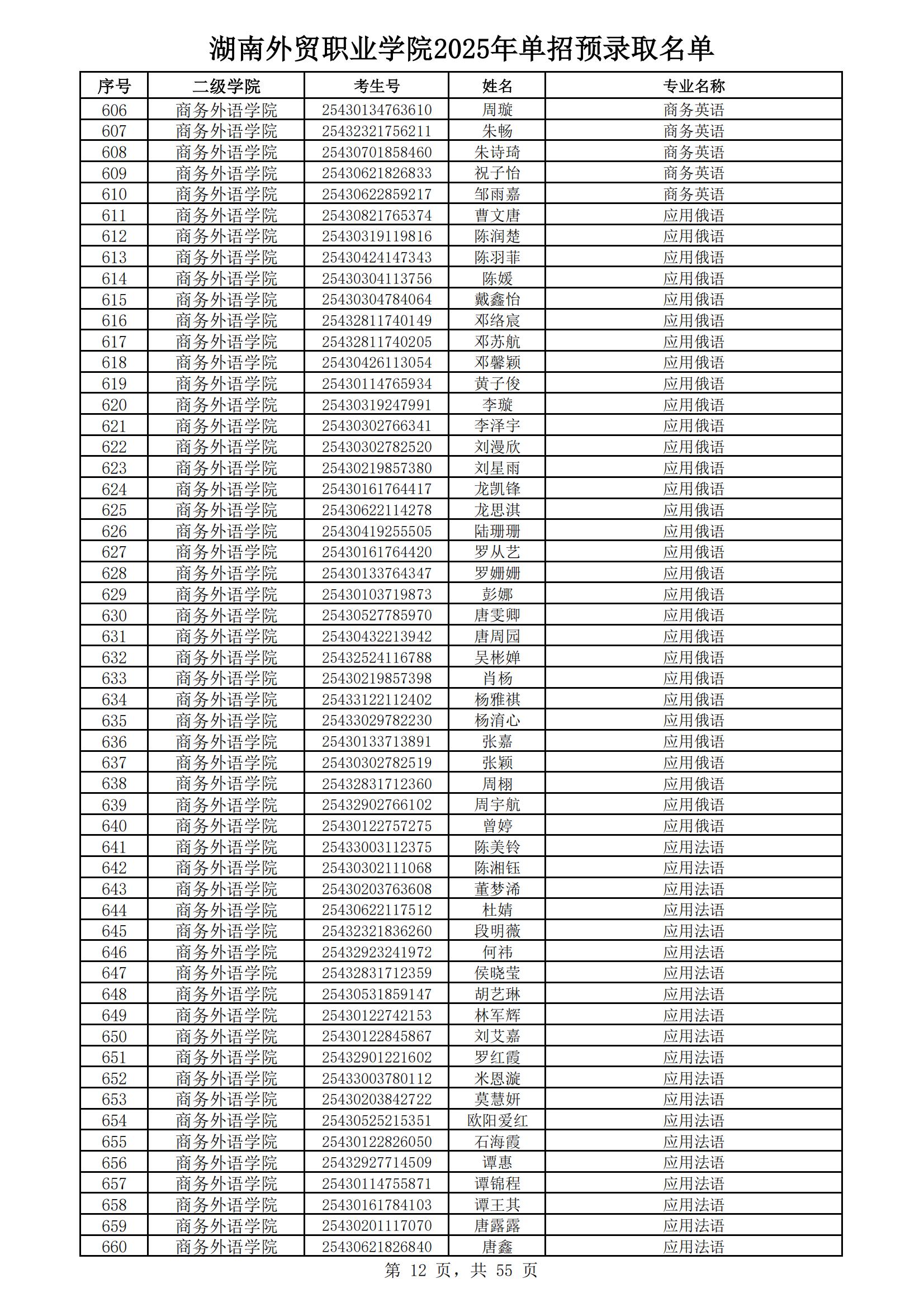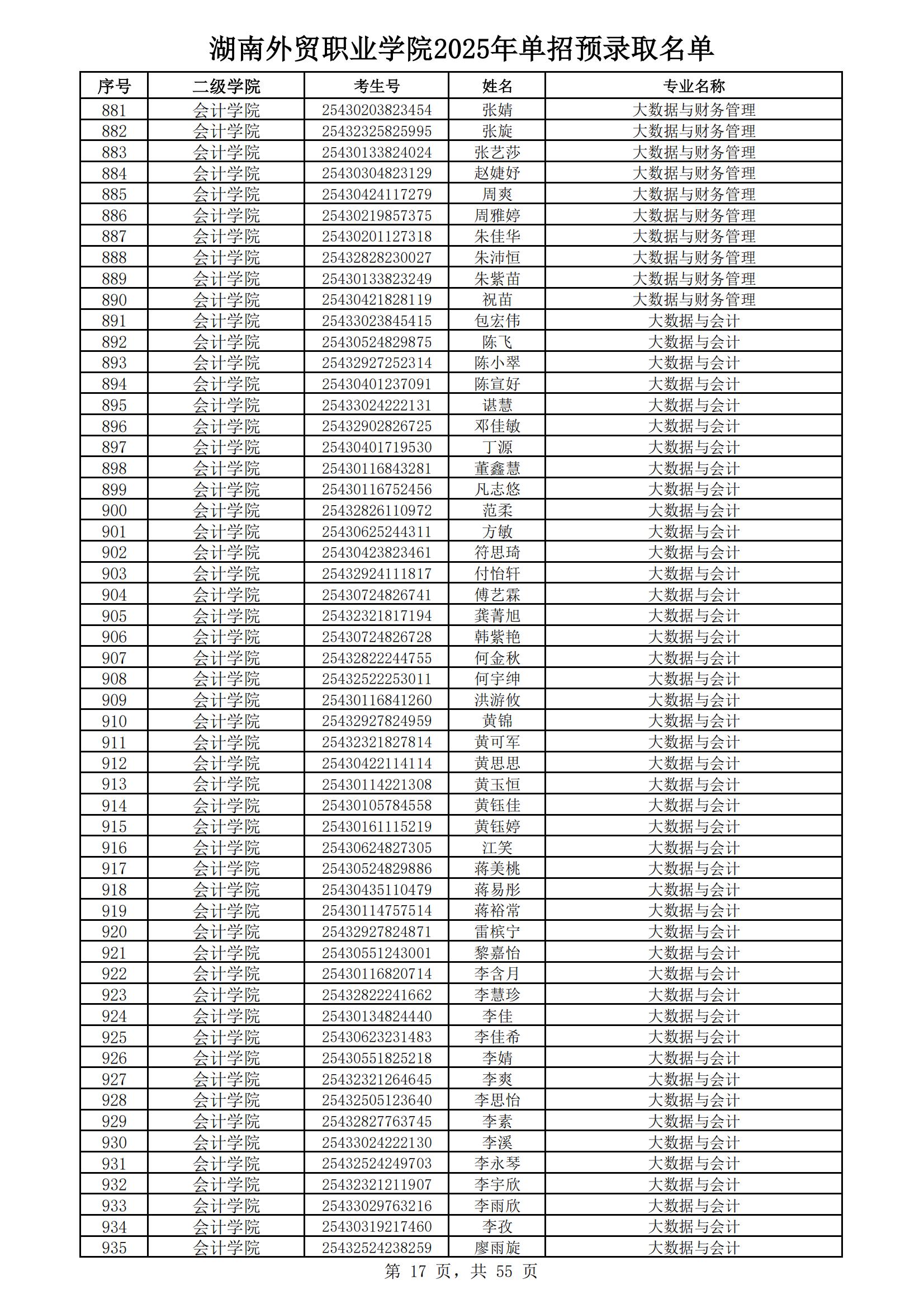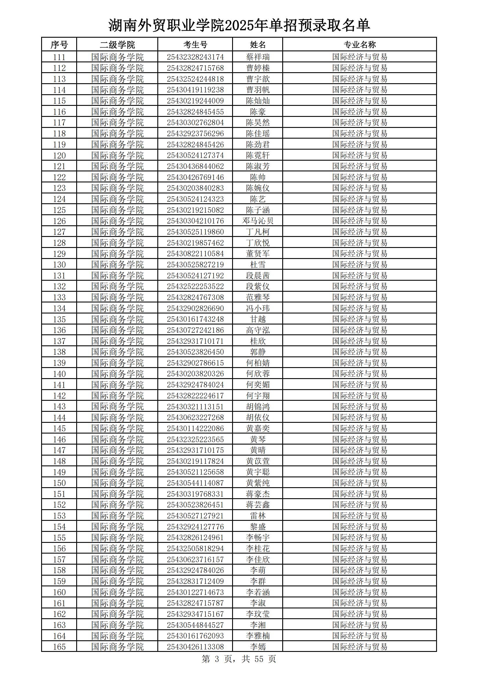 根据《湖南外贸职业学院2025年高职单招章程》录取规则,经学院党委审议并报省教育考试院审核通过,现将我院2025年高职单招分专业分类别拟录取分数线及预录取名单公示如下: 一、拟录取信息公示 公示时间:2025年3月25日-3月31日 (1)分专业分类别录取分数线 1.录取原则:“志愿优先”。 2.对于末位同分考生,依据以下规则进行录取:若末位同分,按考生文化素质测试成绩从高到低排名依次录取。若文化素质测试成绩仍相同:则按“语、数、外”顺序,进行单科成绩排序从高到低依次录取。