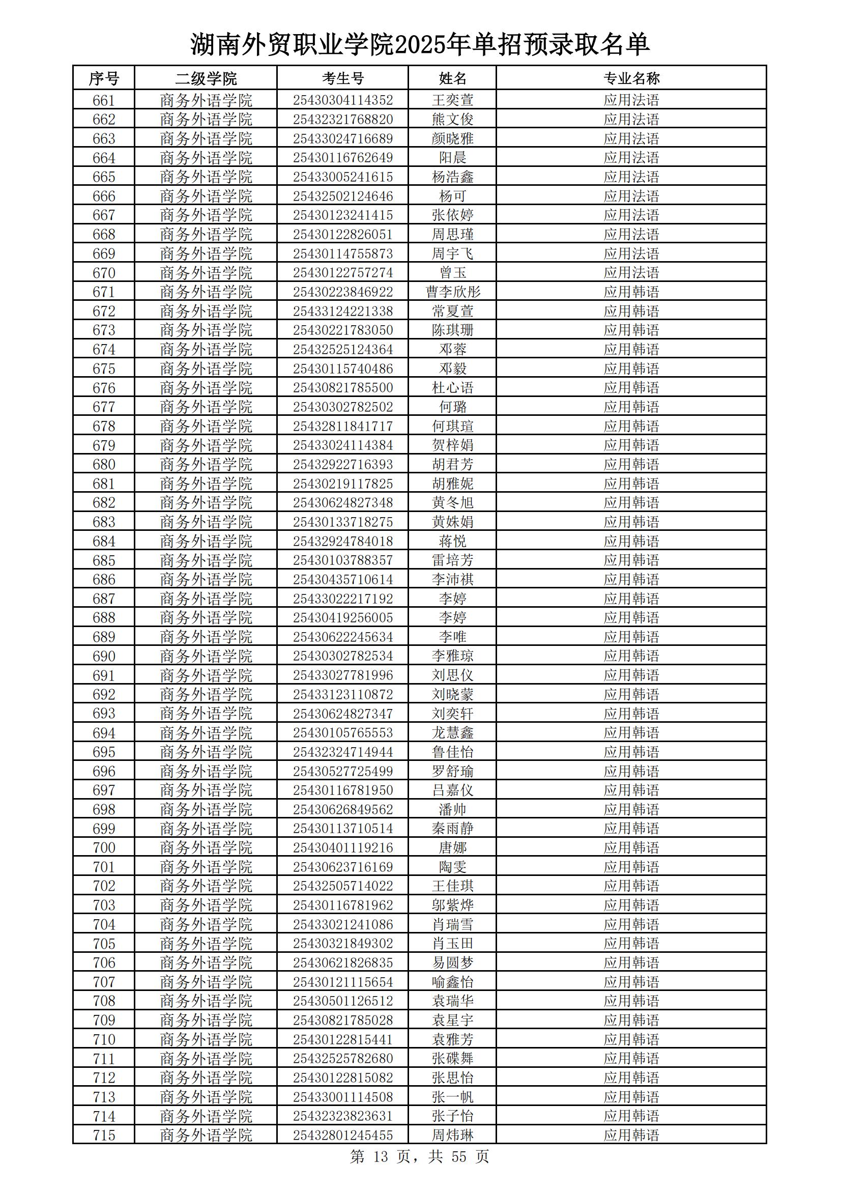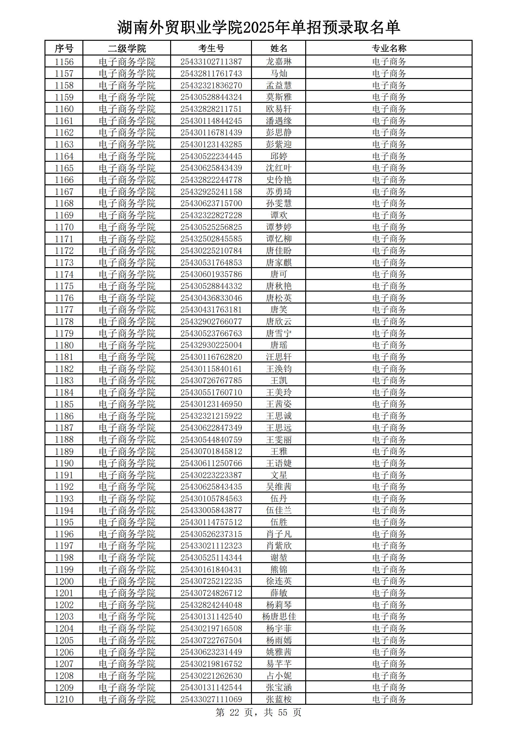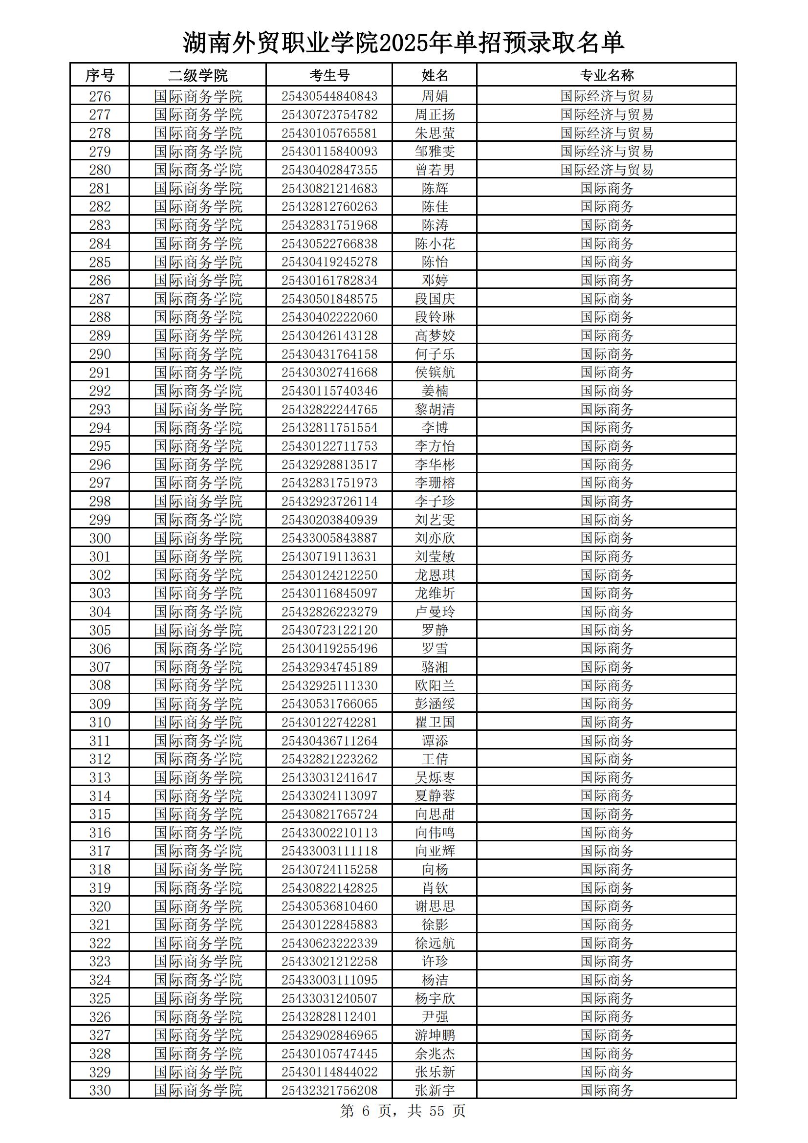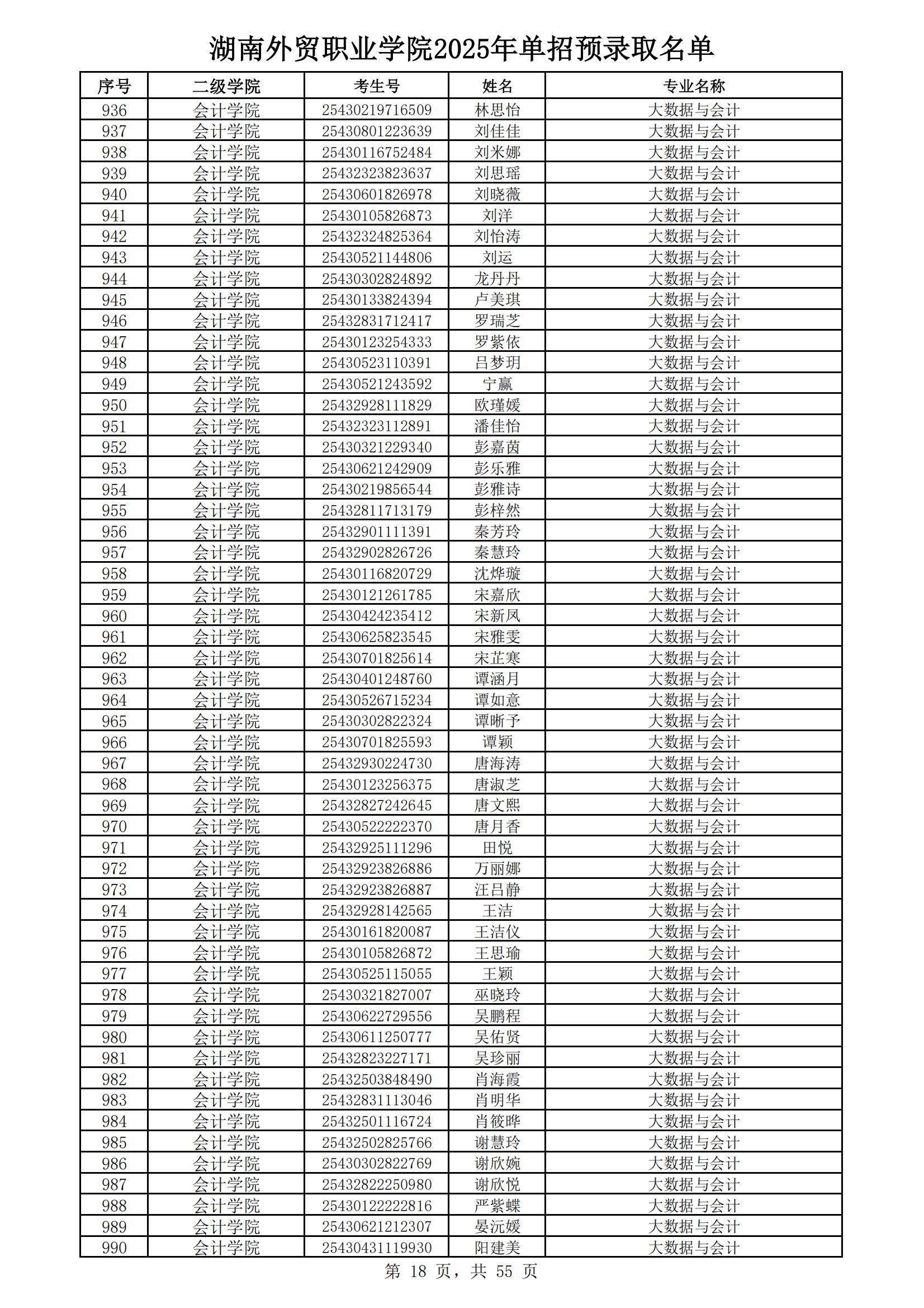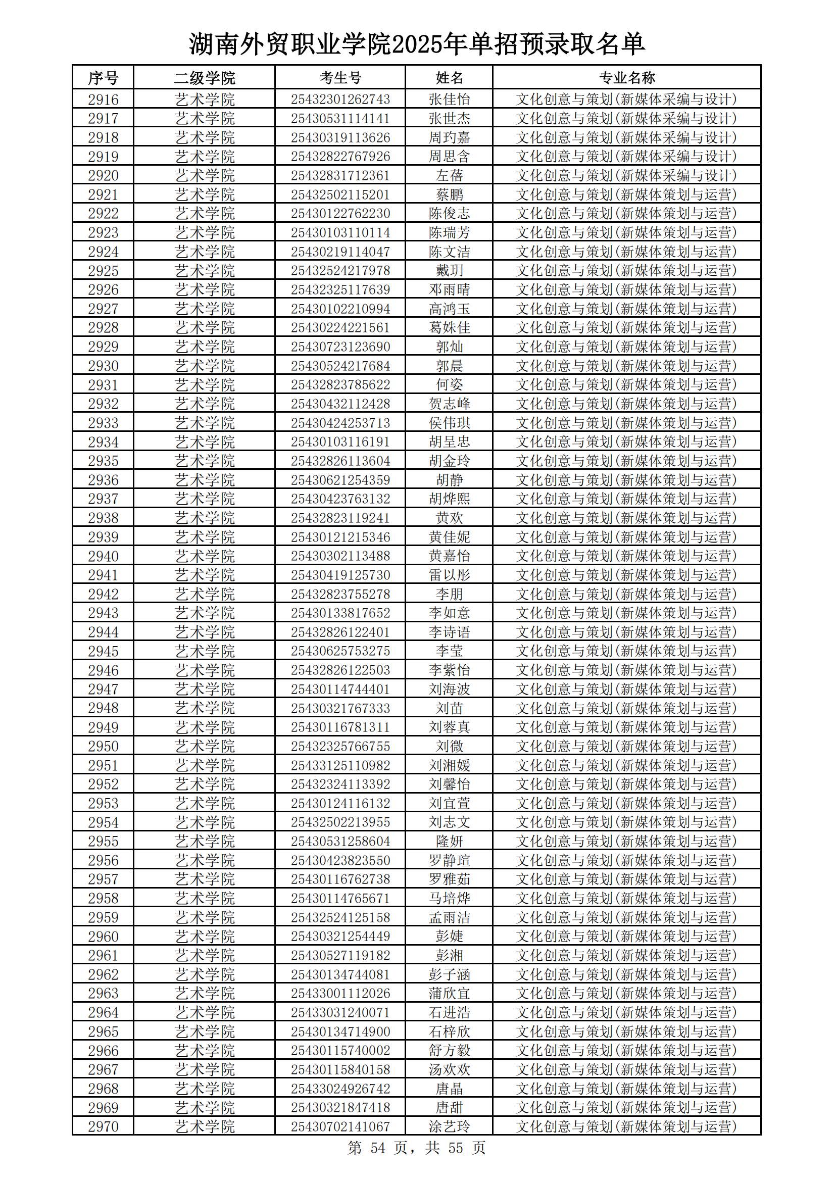 根据《湖南外贸职业学院2025年高职单招章程》录取规则,经学院党委审议并报省教育考试院审核通过,现将我院2025年高职单招分专业分类别拟录取分数线及预录取名单公示如下: 一、拟录取信息公示 公示时间:2025年3月25日-3月31日 (1)分专业分类别录取分数线 1.录取原则:“志愿优先”。 2.对于末位同分考生,依据以下规则进行录取:若末位同分,按考生文化素质测试成绩从高到低排名依次录取。若文化素质测试成绩仍相同:则按“语、数、外”顺序,进行单科成绩排序从高到低依次录取。