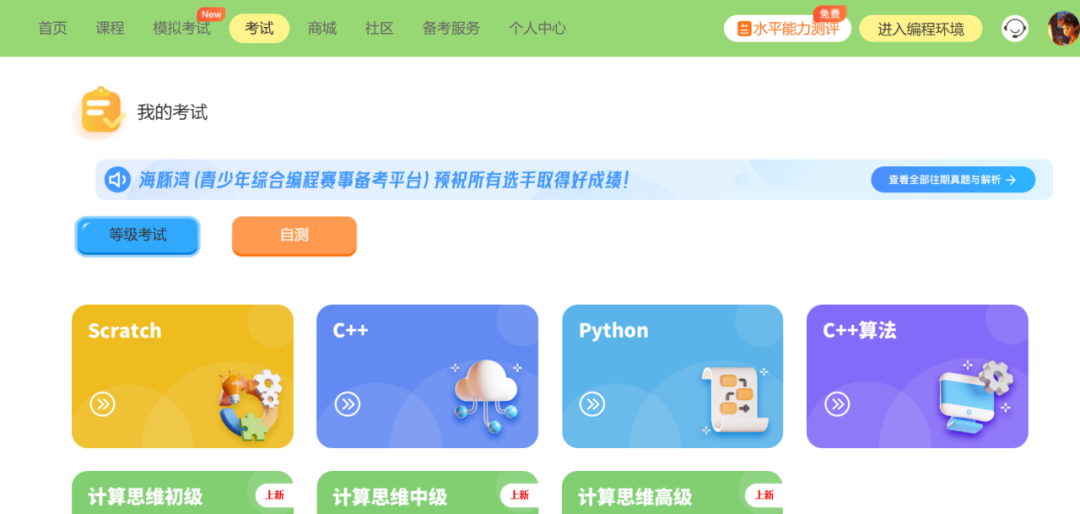 学生端:根据老师给到的网址登录,在【考试】-【等级考试】板块进行报名