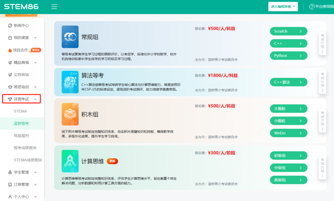 教师端:登录www.stem86.com,在【评测考试】-【等级考试】板块进行报