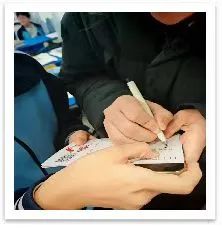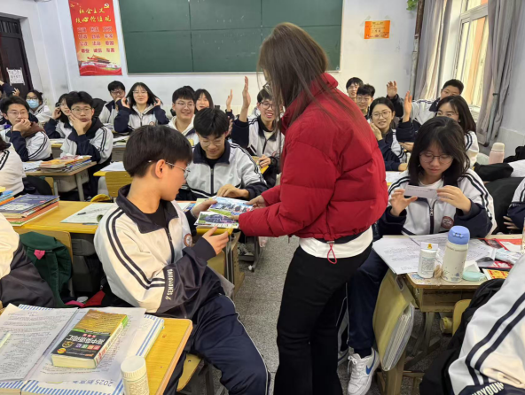 在交流互动环节,各实践团队分发学校主题文创、手绘明信片、励志寄语卡片、文具用品,受到学弟学妹们的热烈欢迎。