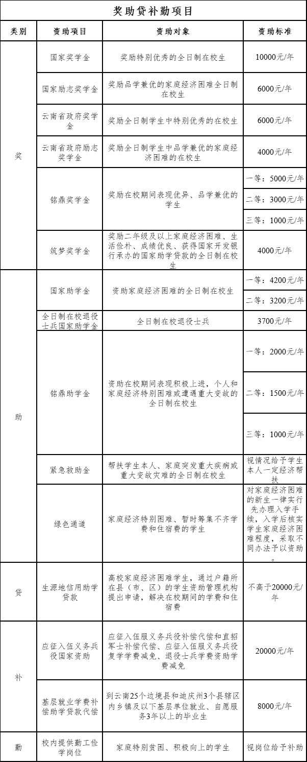 第十六条学校高度重视经济困难学生的资助工作。为鼓励和鞭策学生向就业竞争力强,综合素质高及专业能力强的方向进一步发展,让特殊困难学生获得帮助从而走出逆境、安心学习,懂得感恩,回报社会,除国家划拨的专项资助资金外,学校每年还设立了“铭鼎奖学金、助学金、紧急救助金”,在校期间符合条件的学生都可以申请,形成了以奖、助、贷、补、勤为一体的学生奖助体系。
