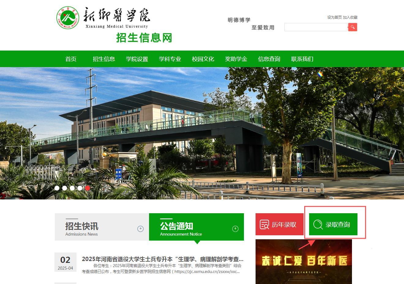我校已完成2025年河南省专升本录取工作,请及时查询录取结果。考生可通过新乡医学院招生信息网或关注我校“新乡医学院招生在线”微信公众号进行查询。专升本录取通知书将随普通本科录取通知书同时发放,请继续关注学校招生信息网通知。