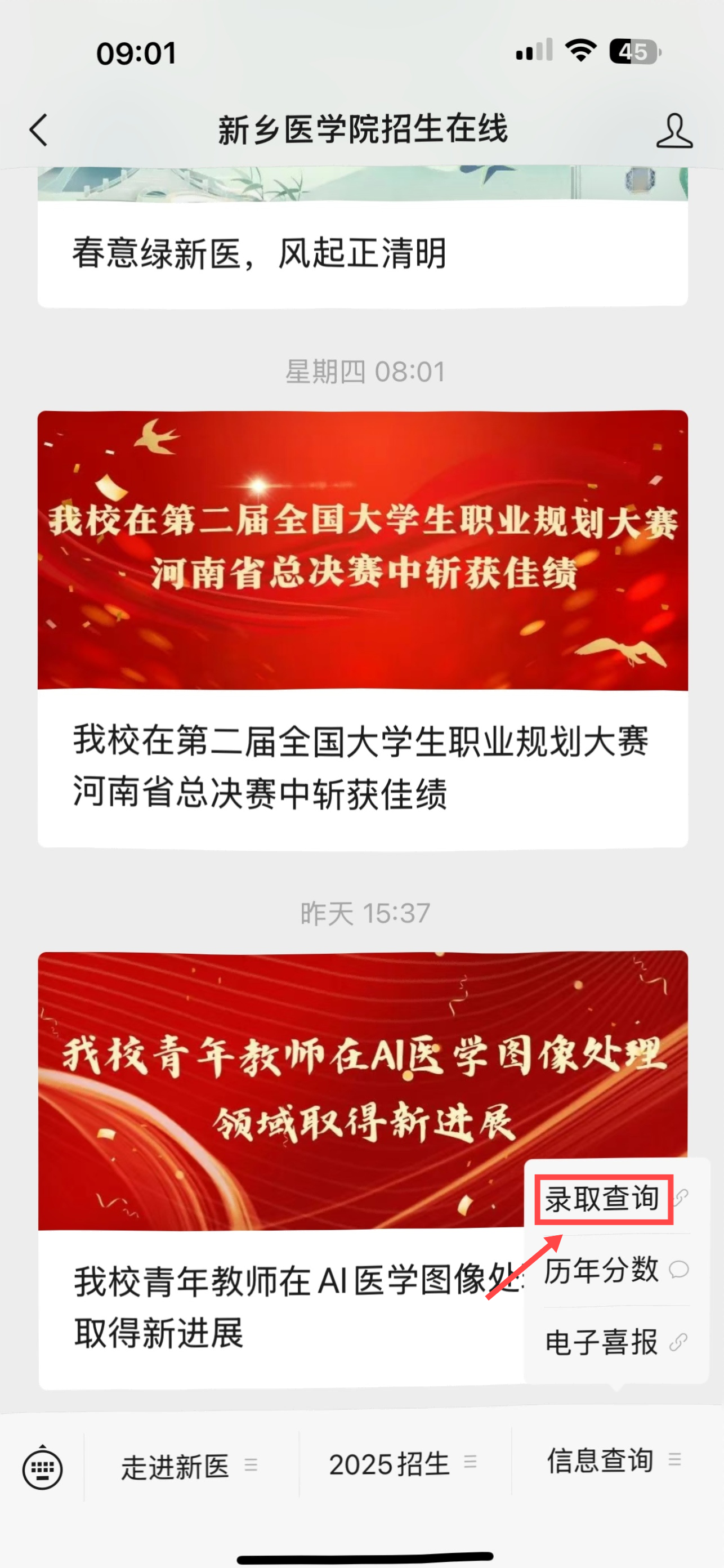 2.微信搜索“新乡医学院招生在线”微信公众号,点击底部菜单栏“信息查询”中的“录取查询”,输入准考证号、身份证号和验证码即可查询。