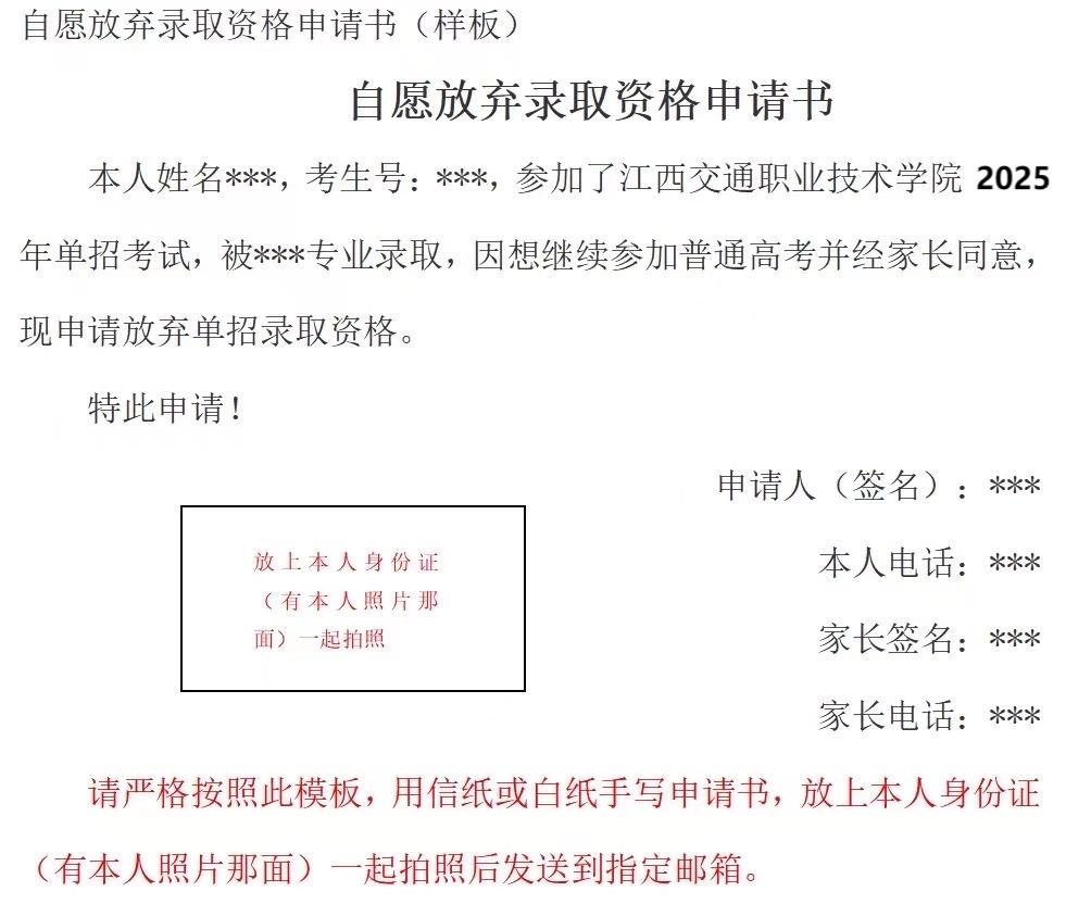 3.确定放弃录取资格的考生务必于4月16日17:00前写好申请书,并把身份证(有本人照片那面)一起放在申请书上拍照后发送到指定邮箱jxjtzsb@163.com,并来电确定是否收到,自愿放弃录取资格申请书(样板)见下图。
