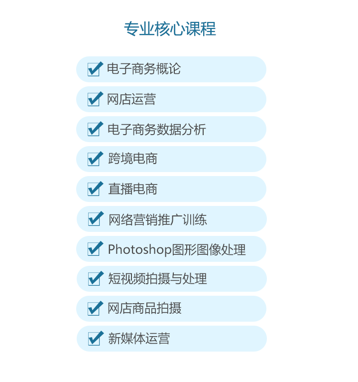 该专业设置合理的专业课程,让学生具有一定的网络营销能力、客服沟通能力、网店运营能力、网店商品摄影和图片处理的能力、电子商务数据分析能力、短视频拍摄与剪辑能力、直播间商品销售和运营能力等,零距离对接行业企业用人需求。