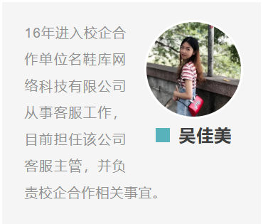 每年6.18,双11学生都到厦门名鞋库网络科技有限公司进行顶岗实习,福建慧成电子商务有限公司、厦门领投电子商务有限公司、特步电商等多家知名企业作为本专业长期合作的顶岗实习单位。