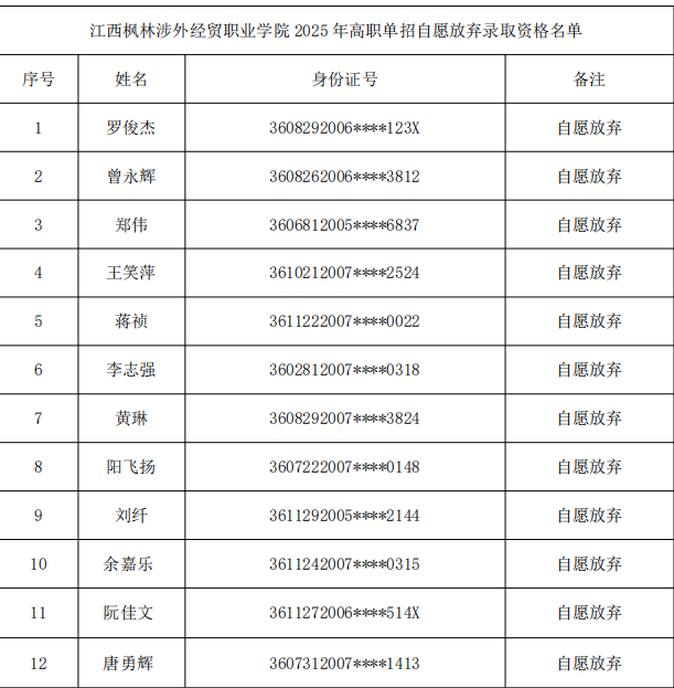 江西枫林涉外经贸职业学院2025年高职单招自愿放弃录取资格名单