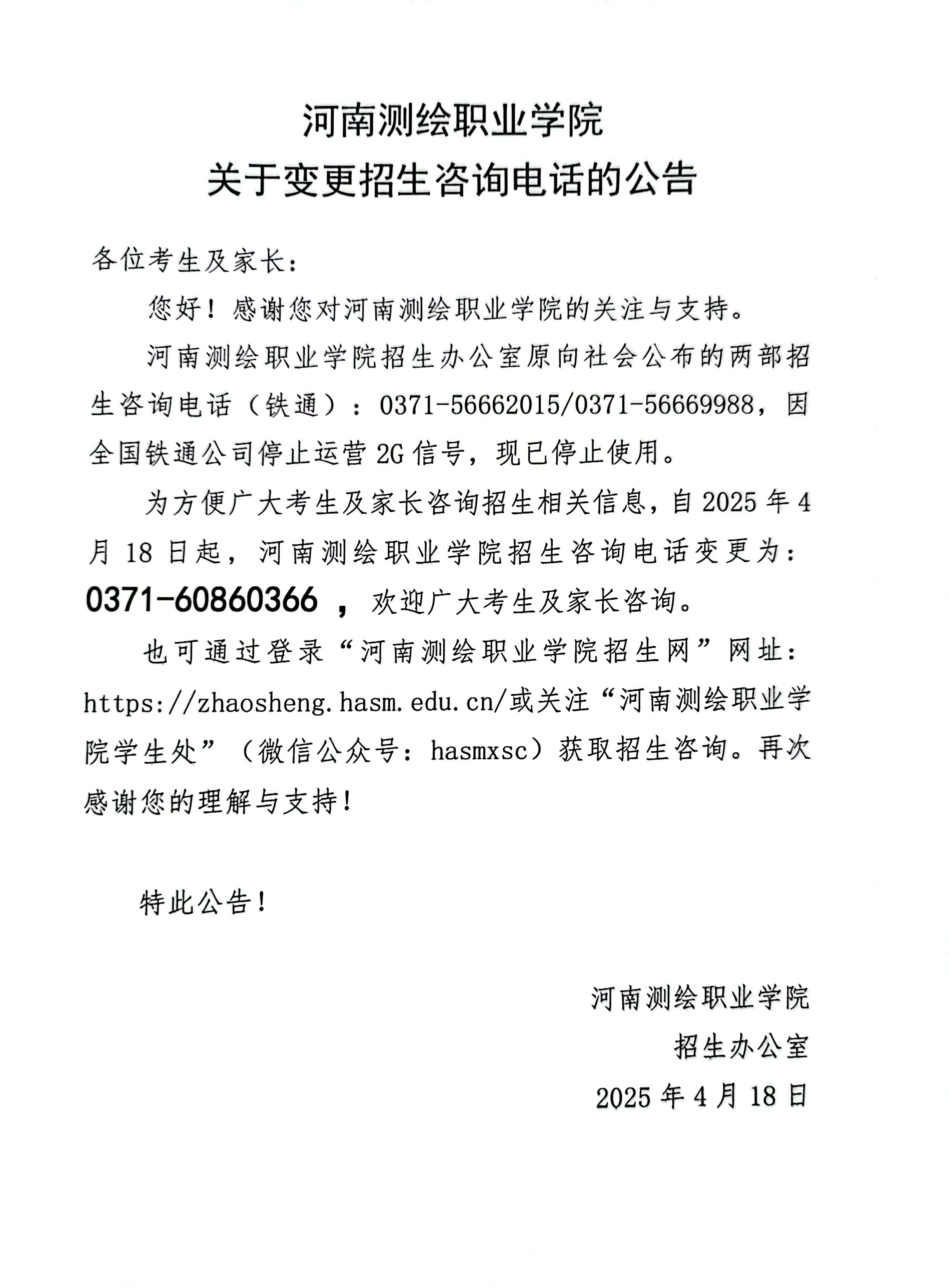 河南测绘职业学院关于变更招生咨询电话的公告